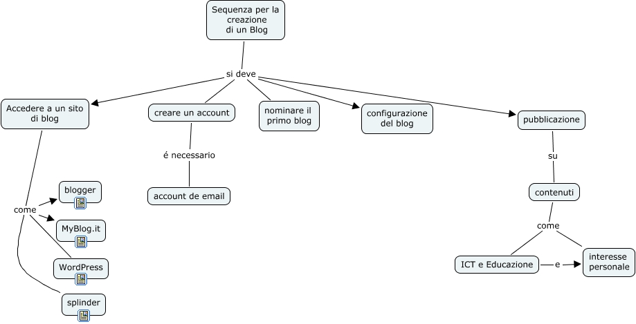 Questa Cmap, creata con IHMC CmapTools, contiene informazioni relative a: uso Blog, Sequenza per la creazione di un Blog si deve pubblicazione, Sequenza per la creazione di un Blog si deve configurazione del blog, pubblicazione su contenuti, Accedere a un sito di blog come blogger, contenuti come interesse personale, Accedere a un sito di blog come WordPress, Sequenza per la creazione di un Blog si deve creare un account, Accedere a un sito di blog come splinder, contenuti come ICT e Educazione, Sequenza per la creazione di un Blog si deve Accedere a un sito di blog, Accedere a un sito di blog come MyBlog.it, creare un account é necessario account de email, Sequenza per la creazione di un Blog si deve nominare il primo blog, ICT e Educazione e interesse personale