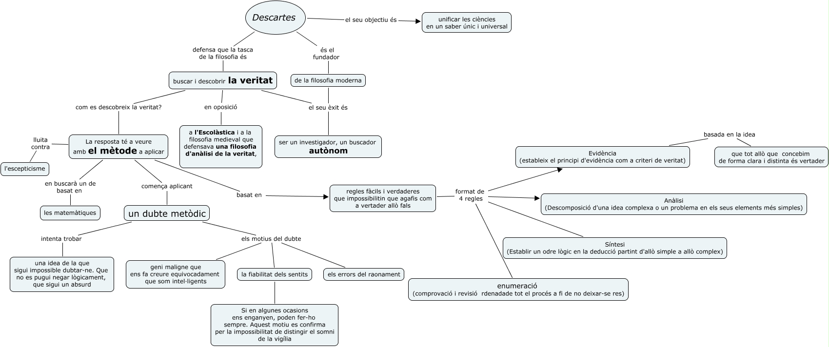 Aquest mapa conceptual conté informació relacionada amb: una visió general de Descartes, de la filosofia moderna el seu èxit és ser un investigador, un buscador autònom, La resposta té a veure amb el mètode a aplicar basat en regles fàcils i verdaderes que impossibilitin que agafis com a vertader allò fals, Descartes defensa que la tasca de la filosofia és buscar i descobrir la veritat, un dubte metòdic intenta trobar una idea de la que sigui impossible dubtar-ne. Que no es pugui negar lògicament, que sigui un absurd, La resposta té a veure amb el mètode a aplicar en buscarà un de basat en les matemàtiques, Descartes és el fundador de la filosofia moderna, buscar i descobrir la veritat el seu èxit és ser un investigador, un buscador autònom, regles fàcils i verdaderes que impossibilitin que agafis com a vertader allò fals format de 4 regles Anàlisi (Descomposició d'una idea complexa o un problema en els seus elements més simples), Evidència (estableix el principi d'evidència com a criteri de veritat) basada en la idea que tot allò que concebim de forma clara i distinta és vertader, Descartes el seu objectiu és unificar les ciències en un saber únic i universal, un dubte metòdic els motius del dubte geni maligne que ens fa creure equivocadament que som intel·ligents, buscar i descobrir la veritat en oposició a l'Escolàstica i a la filosofia medieval que defensava una filosofia d'anàlisi de la veritat,, La resposta té a veure amb el mètode a aplicar lluita contra l'escepticisme, un dubte metòdic els motius del dubte la fiabilitat dels sentits, regles fàcils i verdaderes que impossibilitin que agafis com a vertader allò fals format de 4 regles Evidència (estableix el principi d'evidència com a criteri de veritat), un dubte metòdic els motius del dubte els errors del raonament, la fiabilitat dels sentits Si en algunes ocasions ens enganyen, poden fer-ho sempre. Aquest motiu es confirma per la impossibilitat de distingir el somni de la vigília, regles fàcils i verdaderes que impossibilitin que agafis com a vertader allò fals format de 4 regles Síntesi (Establir un odre lògic en la deducció partint d'allò simple a allò complex), La resposta té a veure amb el mètode a aplicar comença aplicant un dubte metòdic, regles fàcils i verdaderes que impossibilitin que agafis com a vertader allò fals format de 4 regles enumeració (comprovació i revisió rdenadade tot el procés a fi de no deixar-se res)