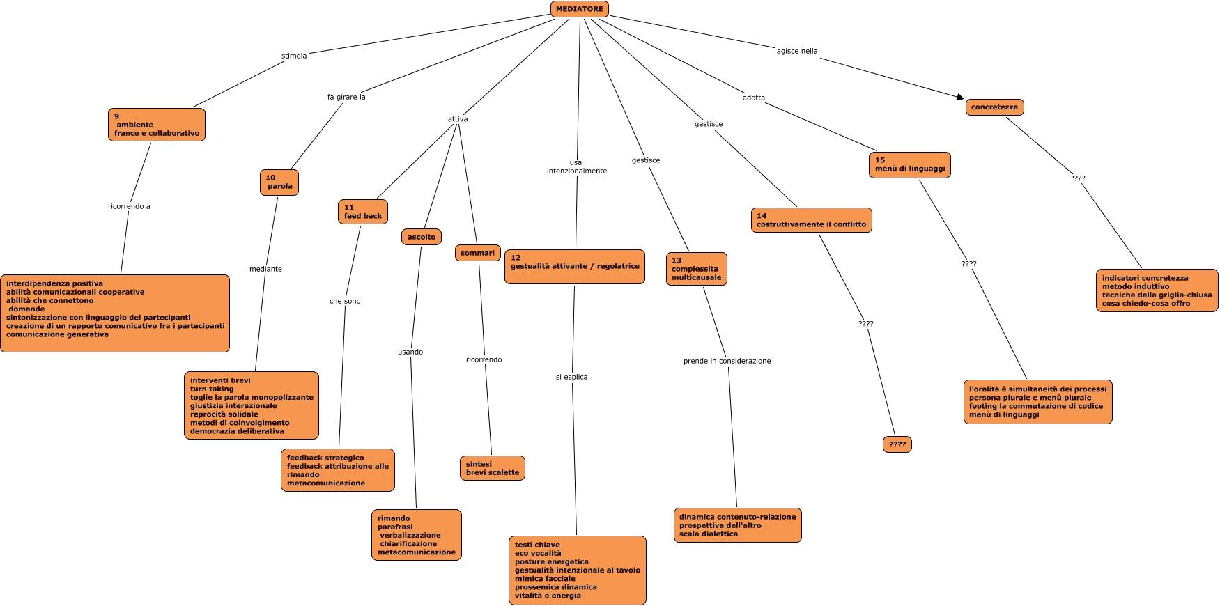 Questa Cmap, creata con IHMC CmapTools, contiene informazioni relative a: mediatore, 9 ambiente franco e collaborativo ricorrendo a interdipendenza positiva abilità comunicazionali cooperative abilità che connettono domande sintonizzazione con linguaggio dei partecipanti creazione di un rapporto comunicativo fra i partecipanti comunicazione generativa, MEDIATORE stimola 9 ambiente franco e collaborativo, MEDIATORE usa intenzionalmente 12 gestualità attivante / regolatrice, 14 costruttivamente il conflitto ???? ????, MEDIATORE adotta 15 menù di linguaggi, ascolto usando rimando parafrasi verbalizzazione chiarificazione metacomunicazione, 10 parola mediante interventi brevi turn taking toglie la parola monopolizzante giustizia interazionale reprocità solidale metodi di coinvolgimento democrazia deliberativa, MEDIATORE attiva sommari, 15 menù di linguaggi ???? l'oralità è simultaneità dei processi persona plurale e menù plurale footing la commutazione di codice menù di linguaggi, MEDIATORE attiva 11 feed back, 13 complessita multicausale prende in considerazione dinamica contenuto-relazione prospettiva dell'altro scala dialettica, MEDIATORE agisce nella concretezza, sommari ricorrendo sintesi brevi scalette, 11 feed back che sono feedback strategico feedback attribuzione alle rimando metacomunicazione, 12 gestualità attivante / regolatrice si esplica testi chiave eco vocalità posture energetica gestualità intenzionale al tavolo mimica facciale prossemica dinamica vitalità e energia, concretezza ???? indicatori concretezza metodo induttivo tecniche della griglia-chiusa cosa chiedo-cosa offro, MEDIATORE attiva ascolto, MEDIATORE fa girare la 10 parola, MEDIATORE gestisce 14 costruttivamente il conflitto, MEDIATORE gestisce 13 complessita multicausale
