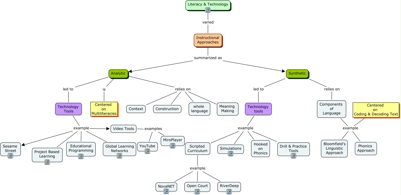 This Concept Map, created with IHMC CmapTools, has information related to: LitTech Instructional Approaches, Video Tools examples MiroPlayer, Components of Language example Phonics Approach, Instructional Approaches summarized as Synthetic, Analytic relies on Context, Technology tools example Drill & Practice Tools, Technology Tools example Project Based Learning, Technology Tools example Sesame Street, Analytic relies on Construction, Video Tools examples YouTube, Synthetic led to Technology tools, Scripted Curriculum example RiverDeep, Technology Tools example Global Learning Networks, Scripted Curriculum example NovaNET, Analytic is Centered on Multiliteracies, Literacy & Technology varied Instructional Approaches, Components of Language example Bloomfield's Linguistic Approach, Technology tools example Scripted Curriculum, Analytic relies on whole language, Technology tools example Simulations, Analytic relies on Meaning Making