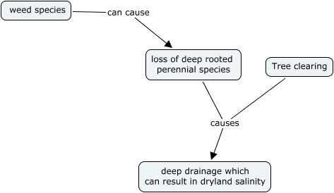 This Concept Map, created with IHMC CmapTools, has information related to: Hydrological impacts, Tree clearing causes deep drainage which can result in dryland salinity, loss of deep rooted perennial species causes deep drainage which can result in dryland salinity, weed species can cause loss of deep rooted perennial species