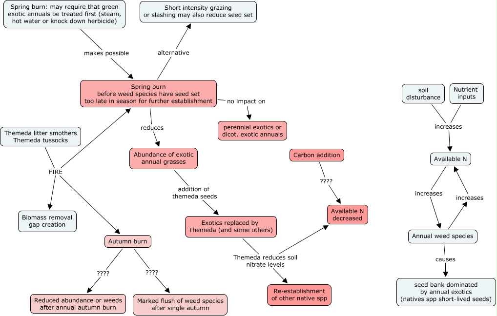 This Concept Map, created with IHMC CmapTools, has information related to: weeds, Themeda litter smothers Themeda tussocks FIRE Autumn burn, Spring burn before weed species have seed set too late in season for further establishment alternative Short intensity grazing or slashing may also reduce seed set, Nutrient inputs increases Available N, Exotics replaced by Themeda (and some others) Themeda reduces soil nitrate levels Re-establishment of other native spp, Available N increases Annual weed species, Spring burn: may require that green exotic annuals be treated first (steam, hot water or knock down herbicide) makes possible Spring burn before weed species have seed set too late in season for further establishment, Exotics replaced by Themeda (and some others) Themeda reduces soil nitrate levels Available N decreased, Autumn burn ???? Reduced abundance or weeds after annual autumn burn, Annual weed species causes seed bank dominated by annual exotics (natives spp short-lived seeds), Spring burn before weed species have seed set too late in season for further establishment reduces Abundance of exotic annual grasses, Annual weed species increases Available N, soil disturbance increases Available N, Carbon addition ???? Available N decreased, Themeda litter smothers Themeda tussocks FIRE Biomass removal gap creation, Abundance of exotic annual grasses addition of themeda seeds Exotics replaced by Themeda (and some others), Spring burn before weed species have seed set too late in season for further establishment no impact on perennial exotics or dicot. exotic annuals, Themeda litter smothers Themeda tussocks FIRE Spring burn before weed species have seed set too late in season for further establishment, Autumn burn ???? Marked flush of weed species after single autumn