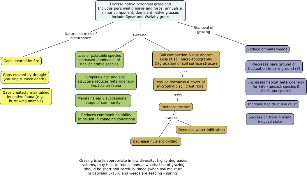 This Concept Map, created with IHMC CmapTools, has information related to: NonThemeda management, Diverse native perennial grassland Includes perennial grasses and forbs, annuals a minor component, dominant native grasses include Spear and Wallaby grass Removal of grazing Reduce annuals weeds, Diverse native perennial grassland Includes perennial grasses and forbs, annuals a minor component, dominant native grasses include Spear and Wallaby grass Grazing Loss of palatable species increased dominance of non-palatable species, Diverse native perennial grassland Includes perennial grasses and forbs, annuals a minor component, dominant native grasses include Spear and Wallaby grass Natural sources of disturbance Gaps created by fire, Increase erosion causes Decrease water infiltration, Increase erosion causes Decrease nutrient cycling, Reduce rischness & cover of microphytic soil crust flora ???? Increase erosion, Soil compaction & disturbance Loss of soil micro-topography Degradation of soil surface strucure ???? Reduce rischness & cover of microphytic soil crust flora, Diverse native perennial grassland Includes perennial grasses and forbs, annuals a minor component, dominant native grasses include Spear and Wallaby grass Grazing Soil compaction & disturbance Loss of soil micro-topography Degradation of soil surface strucure