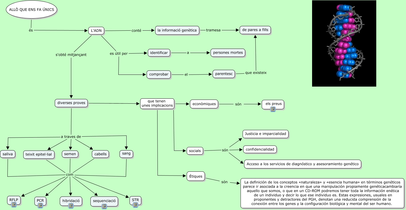 Este Cmap, tiene información relacionada con: allo que ens fa unics, semen com RFLP, sang com PCR, cabells com STR, teixit epitel·lial com RFLP, semen com sequenciació, teixit epitel·lial com hibridació, L'ADN conté la informació genètica, identificar a persones mortes, teixit epitel·lial com PCR, diverses proves a traves de cabells, cabells com PCR, cabells com sequenciació, saliva com RFLP, teixit epitel·lial com sequenciació, sang com sequenciació, sang com hibridació, diverses proves que tenen unes implicacions socials, diverses proves que tenen unes implicacions econòmiques, Ètiques són La definición de los conceptos «naturaleza» y «esencia humana» en términos genéticos parece ir asociada a la creencia en que una manipulación propiamente genéticacambiaría aquello que somos, o que en un CD-ROM podremos tener toda la información enética de un individuo y decir lo que ese individuo es. Estas expresiones, usuales en proponentes y detractores del PGH, denotan una reducida comprensión de la conexión entre los genes y la configuración biológica y mental del ser humano., L'ADN es útil per identificar