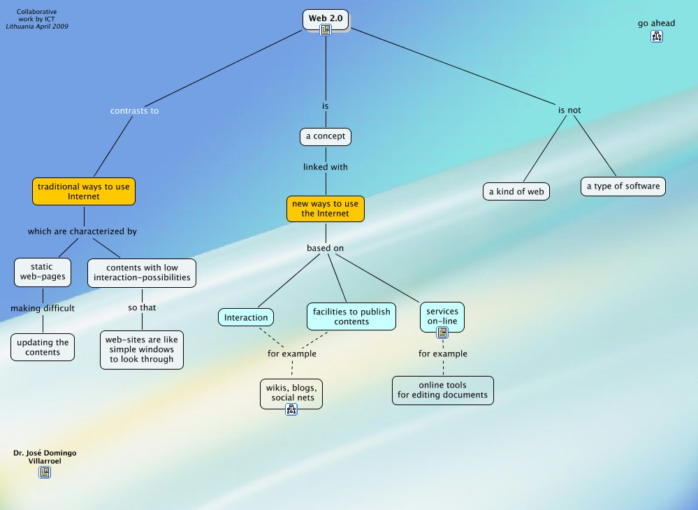 This Concept Map, created with IHMC CmapTools, has information related to: webII_lecture, Interaction for example wikis, blogs, social nets, traditional ways to use Internet which are characterized by static web-pages, traditional ways to use Internet which are characterized by contents with low interaction-possibilities, contents with low interaction-possibilities so that web-sites are like simple windows to look through, new ways to use the Internet based on Interaction, Web 2.0 contrasts to traditional ways to use Internet, static web-pages making difficult updating the contents, a concept linked with new ways to use the Internet, Web 2.0 is not a kind of web, facilities to publish contents for example wikis, blogs, social nets, new ways to use the Internet based on services on-line, Web 2.0 is not a type of software, new ways to use the Internet based on facilities to publish contents, services on-line for example online tools for editing documents, Web 2.0 is a concept