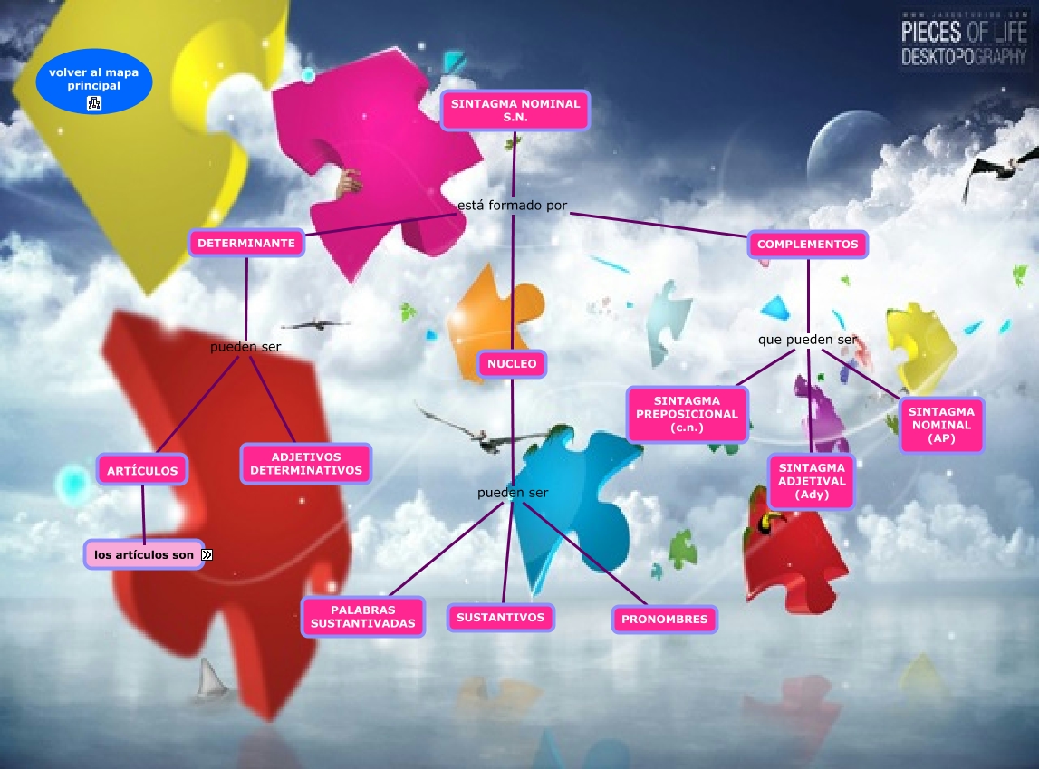 Este Cmap, tiene información relacionada con: SINTAG.NOMINAL, SINTAGMA NOMINAL S.N. está formado por DETERMINANTE, NUCLEO pueden ser PRONOMBRES, ARTÍCULOS pueden ser INDEFINIDOS, COMPLEMENTOS que pueden ser SINTAGMA NOMINAL (AP), NUCLEO pueden ser SUSTANTIVOS, ARTÍCULOS pueden ser DEFINIDOS, COMPLEMENTOS que pueden ser SINTAGMA PREPOSICIONAL (c.n.), COMPLEMENTOS que pueden ser SINTAGMA ADJETIVAL (Ady), SINTAGMA NOMINAL S.N. está formado por COMPLEMENTOS, DETERMINANTE pueden ser ADJETIVOS DETERMINATIVOS, NUCLEO pueden ser PALABRAS SUSTANTIVADAS, SINTAGMA NOMINAL S.N. está formado por NUCLEO, DETERMINANTE pueden ser ARTÍCULOS