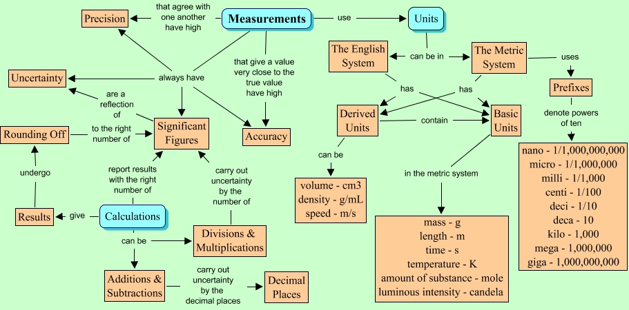 This Concept Map, created with IHMC CmapTools, has information related to: Measurement, Measurements always have Precision, Measurements that agree with one another have high Precision, Derived Units can be volume - cm3 density - g/mL speed - m/s, Units can be in The Metric System, The English System has Basic Units, The Metric System uses Prefixes, Calculations can be Additions & Subtractions, Calculations can be Divisions & Multiplications, Basic Units in the metric system mass - g length - m time - s temperature - K amount of substance - mole luminous intensity - candela, The Metric System has Derived Units, Divisions & Multiplications carry out uncertainty by the number of Significant Figures, Calculations report results with the right number of Significant Figures, Units can be in The English System, Measurements use Units, Additions & Subtractions carry out uncertainty by the decimal places Decimal Places, Prefixes denote powers of ten nano - 1/1,000,000,000 micro - 1/1,000,000 milli - 1/1,000 centi - 1/100 deci - 1/10 deca - 10 kilo - 1,000 mega - 1,000,000 giga - 1,000,000,000, Rounding Off to the right number of Significant Figures, Calculations give Results, Significant Figures are a reflection of Uncertainty, The English System has Derived Units