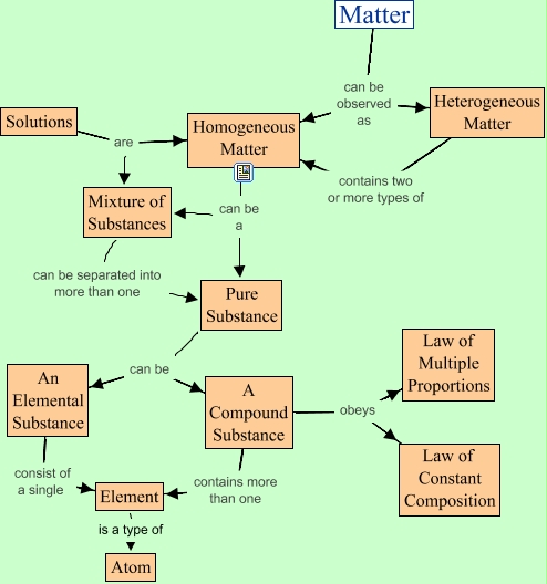 This Concept Map, created with IHMC CmapTools, has information related to: Matter, A Compound Substance obeys Law of Multiple Proportions, Homogeneous Matter can be a Pure Substance, Solutions are Homogeneous Matter, An Elemental Substance consist of a single Element, Matter can be observed as Heterogeneous Matter, Matter can be observed as Homogeneous Matter, A Compound Substance contains more than one Element, Solutions are Mixture of Substances, Element is a type of Atom, Pure Substance can be An Elemental Substance, A Compound Substance obeys Law of Constant Composition, Heterogeneous Matter contains two or more types of Homogeneous Matter, Pure Substance can be A Compound Substance, Mixture of Substances can be separated into more than one Pure Substance, Homogeneous Matter can be a Mixture of Substances