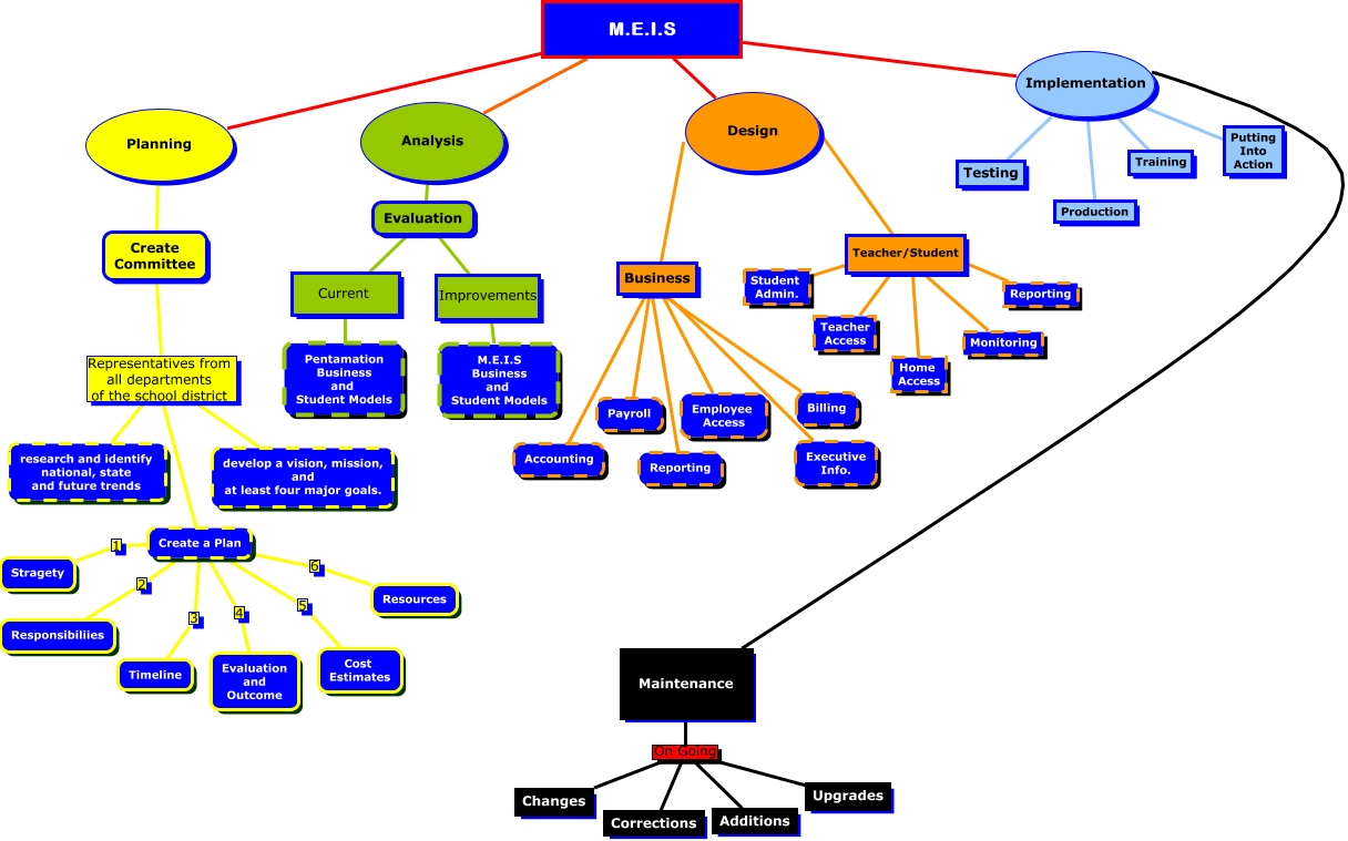 This Concept Map, created with IHMC CmapTools, has information related to: Chapter 3 Map, Maintenance Implementation Training, M.E.I.S Design Teacher/Student, Create a Plan 4 Evaluation and Outcome, Evaluation Current Pentamation Business and Student Models, Maintenance Implementation Testing, Create Committee Representatives from all departments of the school district Create a Plan, Business ???? Accounting, Maintenance On Going Upgrades, Create a Plan 5 Cost Estimates, Maintenance Implementation Putting Into Action, Maintenance On Going Changes, M.E.I.S Implementation Putting Into Action, Teacher/Student ???? Home Access, Teacher/Student ???? Student Admin., Maintenance On Going Additions, M.E.I.S Implementation Production, Business ???? Payroll, Business ???? Billing, Create a Plan 2 Responsibiliies, Business ???? Reporting