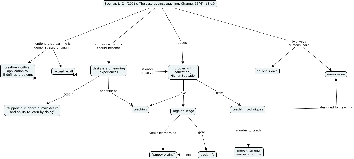 This Concept Map, created with IHMC CmapTools, has information related to: Spence 2001, Spence, L. D. (2001). The case against teaching. Change, 33(6), 13-19 traces problems in education / Higher Education, teaching techniques in order to teach more than one learner at a time, Spence, L. D. (2001). The case against teaching. Change, 33(6), 13-19 two ways humans learn on-one's-own, Spence, L. D. (2001). The case against teaching. Change, 33(6), 13-19 two ways humans learn one-on-one, problems in education / Higher Education from teaching techniques, sage on stage goal pack info, designers of learning experiences opposite of teaching, Spence, L. D. (2001). The case against teaching. Change, 33(6), 13-19 argues instructors should become designers of learning experiences, teaching techniques designed for teaching one-on-one, designers of learning experiences best if "support our inborn human desire and ability to learn by doing", designers of learning experiences in order to solve problems in education / Higher Education, Spence, L. D. (2001). The case against teaching. Change, 33(6), 13-19 mentions that learning is demonstrated through factual recall, Spence, L. D. (2001). The case against teaching. Change, 33(6), 13-19 mentions that learning is demonstrated through creative / critical application to ill-defined problems, pack info into "empty brains", problems in education / Higher Education aka teaching, sage on stage views learners as "empty brains", problems in education / Higher Education aka sage on stage
