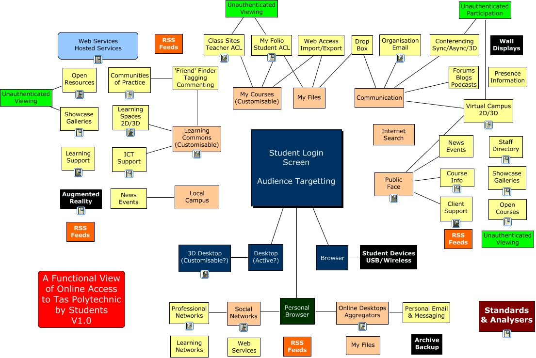 This Concept Map, created with IHMC CmapTools, has information related to: Student Login Screen, My Courses (Customisable) ???? Web Access Import/Export, Conferencing Sync/Async/3D ???? Unauthenticated Participation, Browser ???? Student Devices USB/Wireless, Communication ???? Organisation Email, My Files ???? Web Access Import/Export, Class Sites Teacher ACL ???? Unauthenticated Viewing, Communication ???? Virtual Campus 2D/3D, My Files ???? My Folio Student ACL, Learning Commons (Customisable) ???? ICT Support, Open Resources ???? Unauthenticated Viewing, Unauthenticated Participation ???? Virtual Campus 2D/3D, Personal Browser ???? Social Networks, Social Networks ???? Professional Networks, Public Face ???? Client Support, Desktop (Active?) ???? 3D Desktop (Customisable?), Learning Commons (Customisable) ???? Learning Spaces 2D/3D, My Courses (Customisable) ???? My Folio Student ACL, Online Desktops Aggregators ???? Personal Email & Messaging, Communication ???? Drop Box, Public Face ???? Course Info