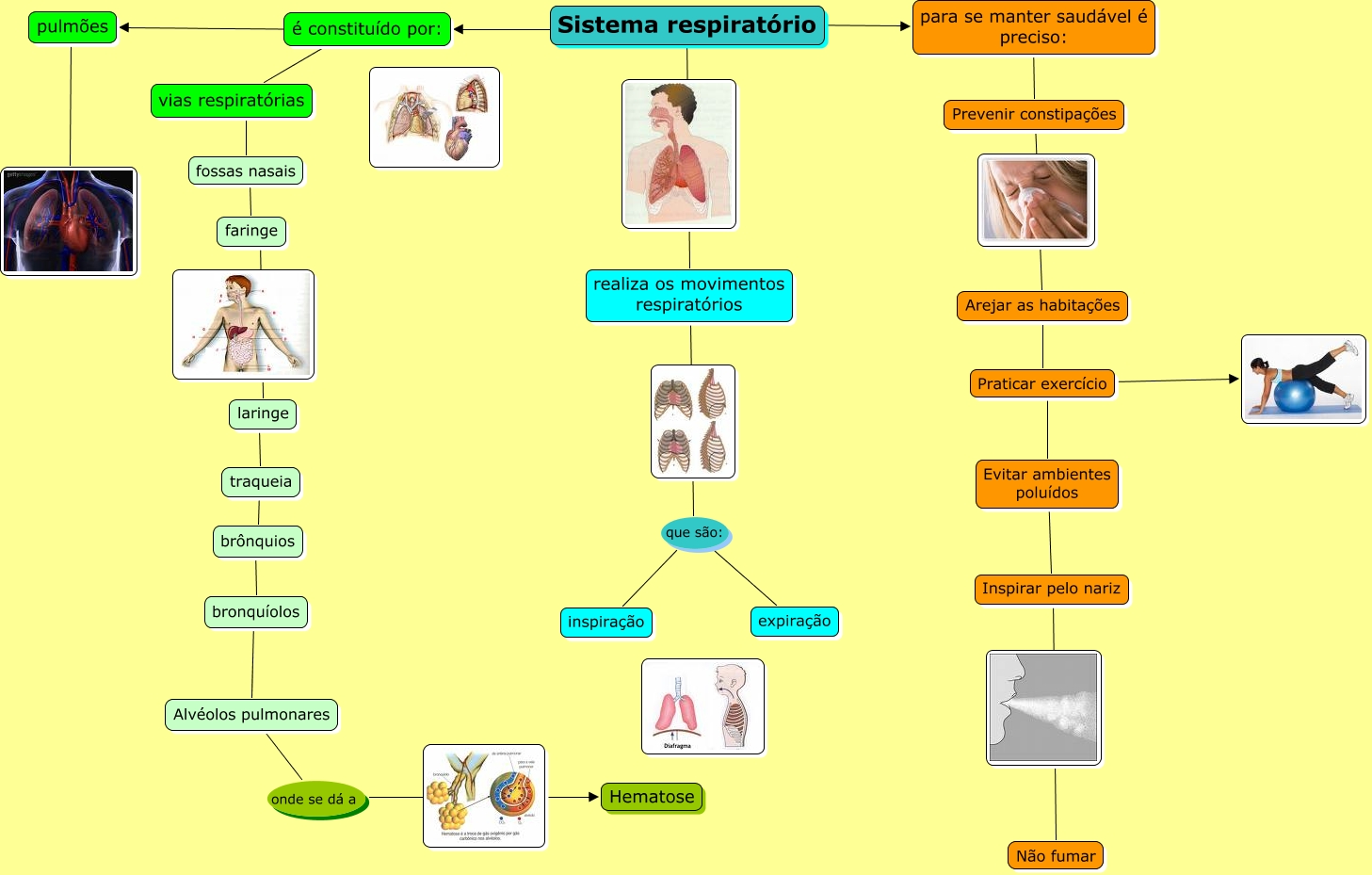 Esse mapa conceitual, produzido no IHMC CmapTools, tem a informação relacionada a: sistema respiratorio, fossas nasais ???? faringe, Alvéolos pulmonares onde se dá a Hematose, vias respiratórias ???? fossas nasais, traqueia ???? brônquios, faringe ???? laringe, Sistema respiratório ???? para se manter saudável é preciso:, é constituído por: ???? pulmões, para se manter saudável é preciso: ???? Prevenir constipações, Praticar exercício ????, Evitar ambientes poluídos ???? Inspirar pelo nariz, Sistema respiratório ???? realiza os movimentos respiratórios, brônquios ???? bronquíolos, é constituído por: ???? vias respiratórias, pulmões ????, Inspirar pelo nariz ???? Não fumar, Sistema respiratório ???? é constituído por:, realiza os movimentos respiratórios que são: inspiração, realiza os movimentos respiratórios que são: expiração, Praticar exercício ???? Evitar ambientes poluídos, bronquíolos ???? Alvéolos pulmonares