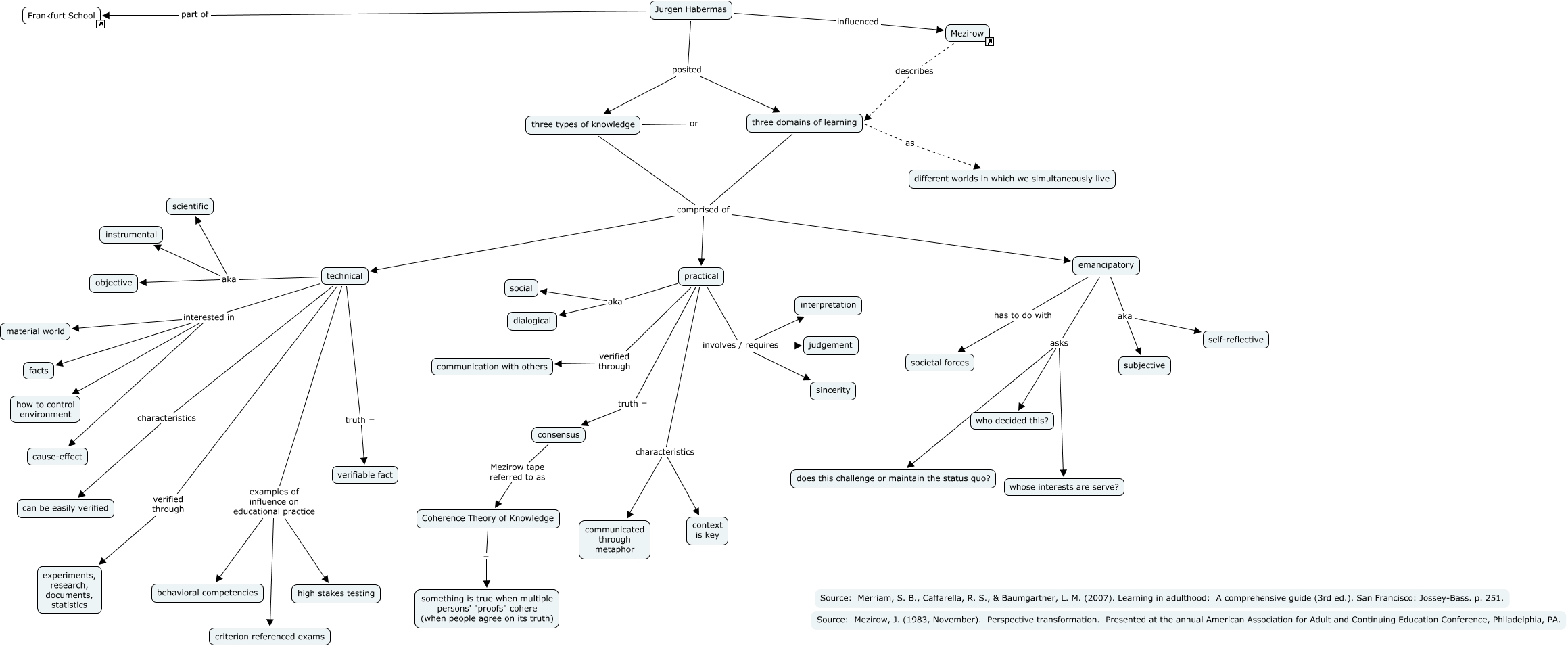 This Concept Map, created with IHMC CmapTools, has information related to: Knowledge Types from Habermas, technical interested in cause-effect, three types of knowledge comprised of practical, technical interested in material world, emancipatory aka self-reflective, three domains of learning as different worlds in which we simultaneously live, technical examples of influence on educational practice high stakes testing, Jurgen Habermas posited three domains of learning, practical characteristics communicated through metaphor, technical aka instrumental, technical interested in facts, Jurgen Habermas part of Frankfurt School, practical aka social, emancipatory asks whose interests are serve?, technical verified through experiments, research, documents, statistics, Mezirow describes three domains of learning, technical examples of influence on educational practice criterion referenced exams, practical verified through communication with others, three types of knowledge comprised of emancipatory, three domains of learning comprised of practical, emancipatory asks who decided this?