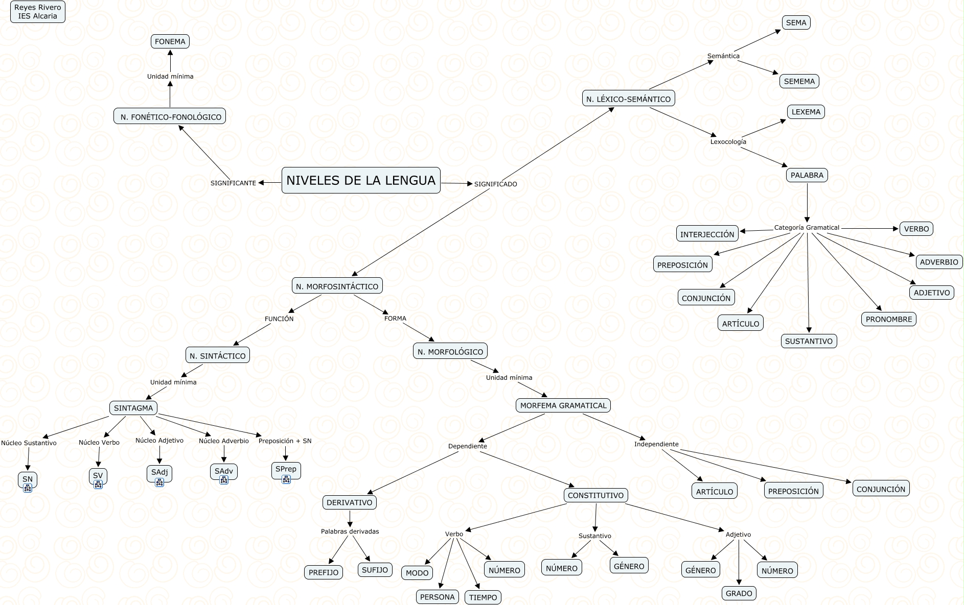 Este Cmap, tiene información relacionada con: Niveles_de_la_Lengua, N. MORFOSINTÁCTICO FORMA N. MORFOLÓGICO, MORFEMA GRAMATICAL Dependiente CONSTITUTIVO, N. SINTÁCTICO Unidad mínima SINTAGMA, CONSTITUTIVO Verbo TIEMPO, SINTAGMA Núcleo Adjetivo SAdj, N. MORFOLÓGICO Unidad mínima MORFEMA GRAMATICAL, NIVELES DE LA LENGUA SIGNIFICADO N. MORFOSINTÁCTICO, NIVELES DE LA LENGUA SIGNIFICANTE N. FONÉTICO-FONOLÓGICO, PALABRA Categoría Gramatical ADVERBIO, MORFEMA GRAMATICAL Independiente PREPOSICIÓN, NIVELES DE LA LENGUA SIGNIFICADO N. LÉXICO-SEMÁNTICO, DERIVATIVO Palabras derivadas PREFIJO, SINTAGMA Preposición + SN SPrep, CONSTITUTIVO Adjetivo GÉNERO, CONSTITUTIVO Adjetivo NÚMERO, SINTAGMA Núcleo Sustantivo SN, CONSTITUTIVO Sustantivo NÚMERO, PALABRA Categoría Gramatical ARTÍCULO, PALABRA Categoría Gramatical PREPOSICIÓN, MORFEMA GRAMATICAL Dependiente DERIVATIVO