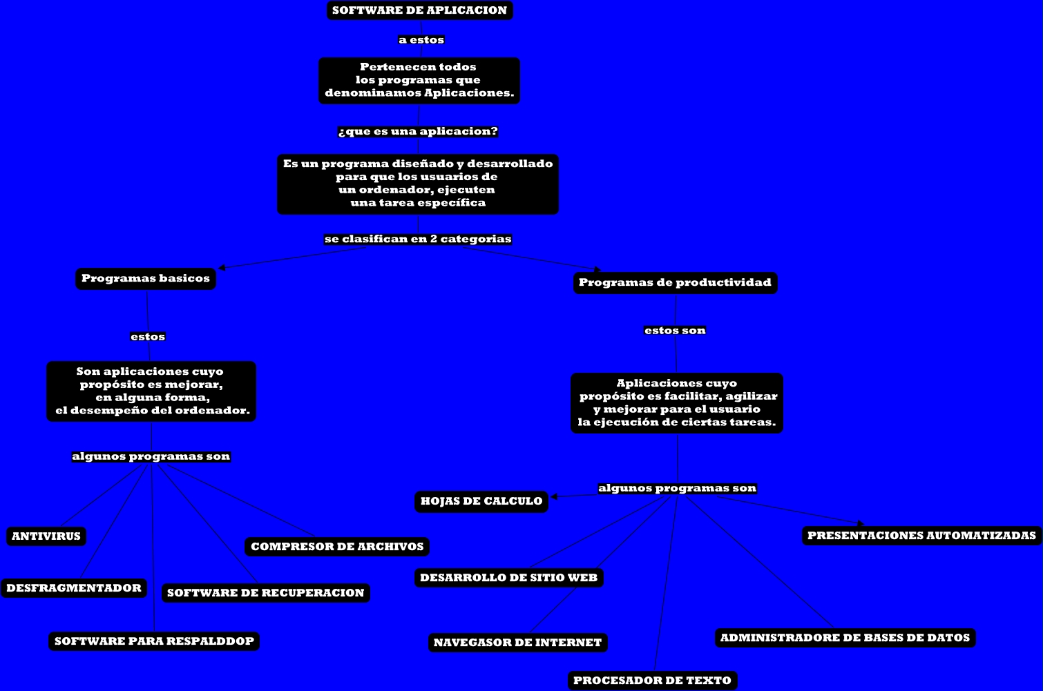 Este Cmap, tiene información relacionada con: software de aplicacion, Aplicaciones cuyo propósito es facilitar, agilizar y mejorar para el usuario la ejecución de ciertas tareas. algunos programas son ADMINISTRADORE DE BASES DE DATOS, Aplicaciones cuyo propósito es facilitar, agilizar y mejorar para el usuario la ejecución de ciertas tareas. algunos programas son PRESENTACIONES AUTOMATIZADAS, Aplicaciones cuyo propósito es facilitar, agilizar y mejorar para el usuario la ejecución de ciertas tareas. algunos programas son DESARROLLO DE SITIO WEB, Pertenecen todos los programas que denominamos Aplicaciones. ¿que es una aplicacion? Es un programa diseñado y desarrollado para que los usuarios de un ordenador, ejecuten una tarea específica, Programas basicos estos Son aplicaciones cuyo propósito es mejorar, en alguna forma, el desempeño del ordenador., Son aplicaciones cuyo propósito es mejorar, en alguna forma, el desempeño del ordenador. algunos programas son SOFTWARE DE RECUPERACION, SOFTWARE DE APLICACION a estos Pertenecen todos los programas que denominamos Aplicaciones., Aplicaciones cuyo propósito es facilitar, agilizar y mejorar para el usuario la ejecución de ciertas tareas. algunos programas son NAVEGASOR DE INTERNET, Son aplicaciones cuyo propósito es mejorar, en alguna forma, el desempeño del ordenador. algunos programas son DESFRAGMENTADOR, Es un programa diseñado y desarrollado para que los usuarios de un ordenador, ejecuten una tarea específica se clasifican en 2 categorias Programas basicos, Es un programa diseñado y desarrollado para que los usuarios de un ordenador, ejecuten una tarea específica se clasifican en 2 categorias Programas de productividad, Son aplicaciones cuyo propósito es mejorar, en alguna forma, el desempeño del ordenador. algunos programas son ANTIVIRUS, Aplicaciones cuyo propósito es facilitar, agilizar y mejorar para el usuario la ejecución de ciertas tareas. algunos programas son PROCESADOR DE TEXTO, Programas de productividad estos son Aplicaciones cuyo propósito es facilitar, agilizar y mejorar para el usuario la ejecución de ciertas tareas., Son aplicaciones cuyo propósito es mejorar, en alguna forma, el desempeño del ordenador. algunos programas son SOFTWARE PARA RESPALDDOP, Aplicaciones cuyo propósito es facilitar, agilizar y mejorar para el usuario la ejecución de ciertas tareas. algunos programas son HOJAS DE CALCULO, Son aplicaciones cuyo propósito es mejorar, en alguna forma, el desempeño del ordenador. algunos programas son COMPRESOR DE ARCHIVOS