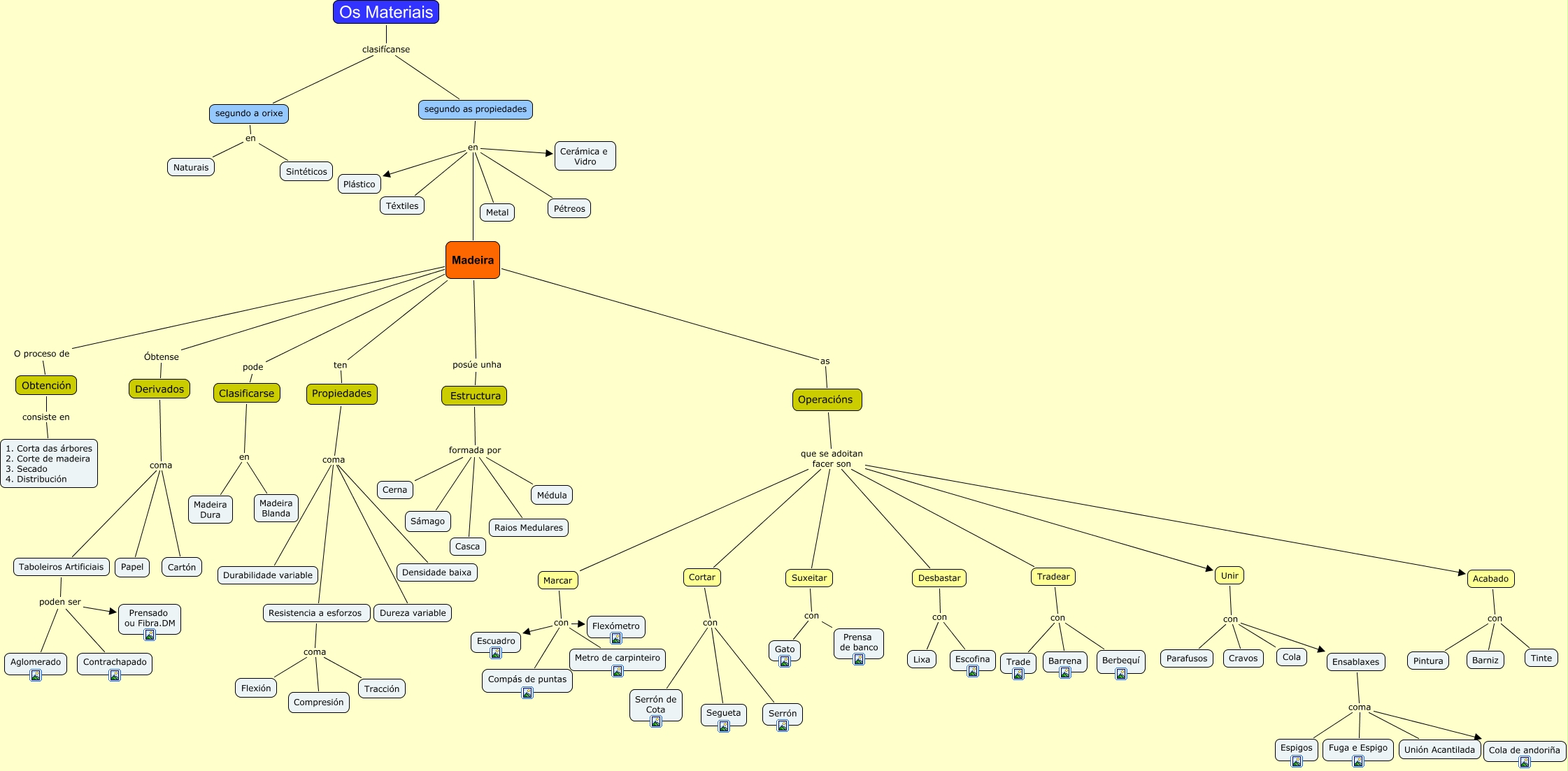 Este Cmap, tiene información relacionada con: Os materiais-A madeira, Ensablaxes coma Espigos, Unir con Parafusos, Operacións que se adoitan facer son Tradear, Ensablaxes coma Fuga e Espigo, Unir con Ensablaxes, segundo as propiedades en Madeira, Estructura formada por Sámago, Operacións que se adoitan facer son Cortar, Madeira O proceso de Obtención, Operacións que se adoitan facer son Suxeitar, Estructura formada por Cerna, Marcar con Escuadro, Acabado con Barniz, Cortar con Segueta, Madeira as Operacións, Resistencia a esforzos coma Tracción, Operacións que se adoitan facer son Marcar, Derivados coma Papel, segundo as propiedades en Téxtiles, Resistencia a esforzos coma Flexión