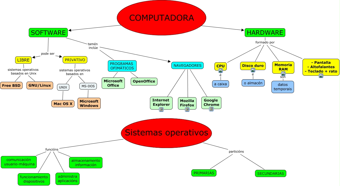 Este Cmap, tiene información relacionada con: A computadora, Disco duro é o almacén, PROGRAMAS OFIMÁTICOS ???? Microsoft Office, UNIX ???? Mac OS X, SOFTWARE tamén inclúe NAVEGADORES, COMPUTADORA formada por HARDWARE, Sistemas operativos funcións almacenamento información, PRIVATIVO sistemas operativos basados en MS-DOS, SOFTWARE pode ser LIBRE, MS-DOS ???? Microsoft Windows, Memoria RAM son datos temporais, LIBRE sistemas operativos basados en Unix Free BSD, Sistemas operativos funcións funcionamiento dispositivos, NAVEGADORES ???? Mozilla Firefox, Sistemas operativos funcións administra aplicacións, NAVEGADORES ???? Google Chrome, Sistemas operativos particións SECUNDARIAS, HARDWARE formado por - Pantalla - Altofalantes - Teclado + rato, Sistemas operativos particións PRIMARIAS, NAVEGADORES ???? Internet Explorer, HARDWARE formado por CPU