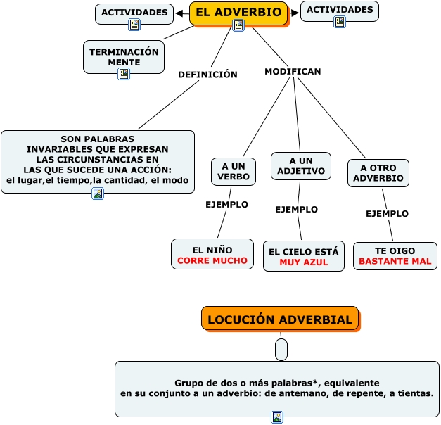 Este Cmap, tiene información relacionada con: ADVERBIO, A UN VERBO EJEMPLO EL NIÑO CORRE MUCHO, EL ADVERBIO ???? TERMINACIÓN MENTE, EL ADVERBIO MODIFICAN A OTRO ADVERBIO, EL ADVERBIO ???? ACTIVIDADES, EL ADVERBIO DEFINICIÓN SON PALABRAS INVARIABLES QUE EXPRESAN LAS CIRCUNSTANCIAS EN LAS QUE SUCEDE UNA ACCIÓN: el lugar,el tiempo,la cantidad, el modo, EL ADVERBIO MODIFICAN A UN ADJETIVO, LOCUCIÓN ADVERBIAL ????, EL ADVERBIO ???? ACTIVIDADES, A OTRO ADVERBIO EJEMPLO TE OIGO BASTANTE MAL, EL ADVERBIO MODIFICAN A UN VERBO, A UN ADJETIVO EJEMPLO EL CIELO ESTÁ MUY AZUL