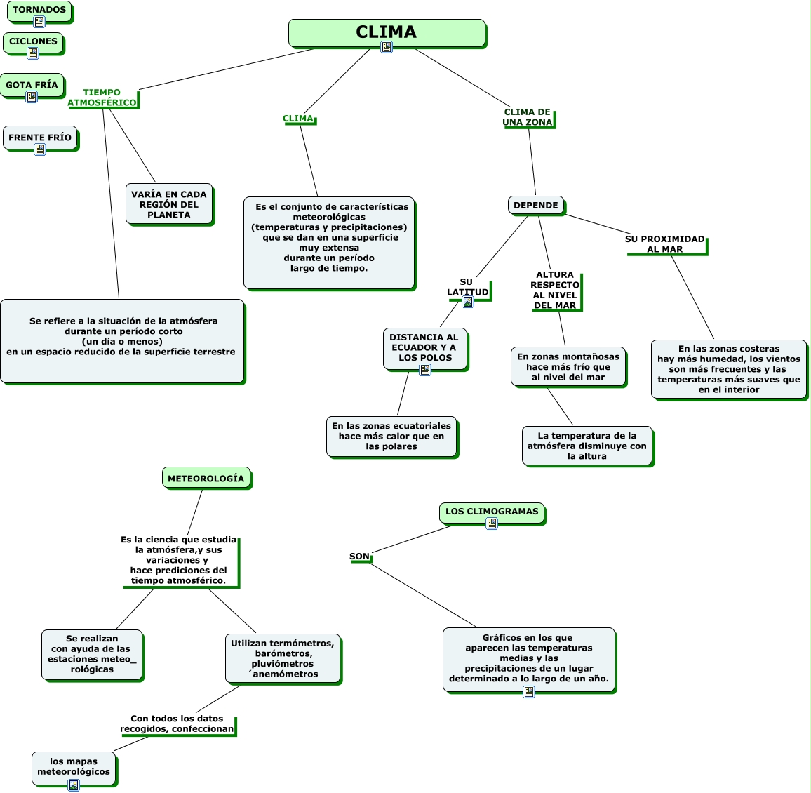 Este Cmap, tiene información relacionada con: CLIMA, DEPENDE SU LATITUD DISTANCIA AL ECUADOR Y A LOS POLOS, DEPENDE SU PROXIMIDAD AL MAR En las zonas costeras hay más humedad, los vientos son más frecuentes y las temperaturas más suaves que en el interior, CLIMA TIEMPO ATMOSFÉRICO VARÍA EN CADA REGIÓN DEL PLANETA, DISTANCIA AL ECUADOR Y A LOS POLOS ???? En las zonas ecuatoriales hace más calor que en las polares, Utilizan termómetros, barómetros, pluviómetros ´anemómetros Con todos los datos recogidos, confeccionan los mapas meteorológicos, LOS CLIMOGRAMAS SON Gráficos en los que aparecen las temperaturas medias y las precipitaciones de un lugar determinado a lo largo de un año., DEPENDE ALTURA RESPECTO AL NIVEL DEL MAR En zonas montañosas hace más frío que al nivel del mar, CLIMA CLIMA DE UNA ZONA DEPENDE, METEOROLOGÍA Es la ciencia que estudia la atmósfera,y sus variaciones y hace prediciones del tiempo atmosférico. Se realizan con ayuda de las estaciones meteo_ rológicas, En zonas montañosas hace más frío que al nivel del mar ???? La temperatura de la atmósfera disminuye con la altura, CLIMA CLIMA Es el conjunto de características meteorológicas (temperaturas y precipitaciones) que se dan en una superficie muy extensa durante un período largo de tiempo., CLIMA TIEMPO ATMOSFÉRICO Se refiere a la situación de la atmósfera durante un período corto (un día o menos) en un espacio reducido de la superficie terrestre, METEOROLOGÍA Es la ciencia que estudia la atmósfera,y sus variaciones y hace prediciones del tiempo atmosférico. Utilizan termómetros, barómetros, pluviómetros ´anemómetros