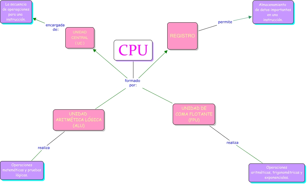 Este Cmap, tiene información relacionada con: CPU, REGISTRO permite Almacenamiento de datos importantes en una instrucción., CPU formado por: UNIDAD CENTRAL (UC), CPU formado por: UNIDAD DE COMA FLOTANTE (FPU), UNIDAD ARITMÉTICA LÓGICA (ALU) realiza Operaciones matemáticas y pruebas lógicas., UNIDAD DE COMA FLOTANTE (FPU) realiza Operaciones aritméticas, trigonométricas y exponenciales., CPU formado por: REGISTRO, CPU formado por: UNIDAD ARITMÉTICA LÓGICA (ALU), UNIDAD CENTRAL (UC) encargada de: La secuencia de operaqciones para una instrucción.