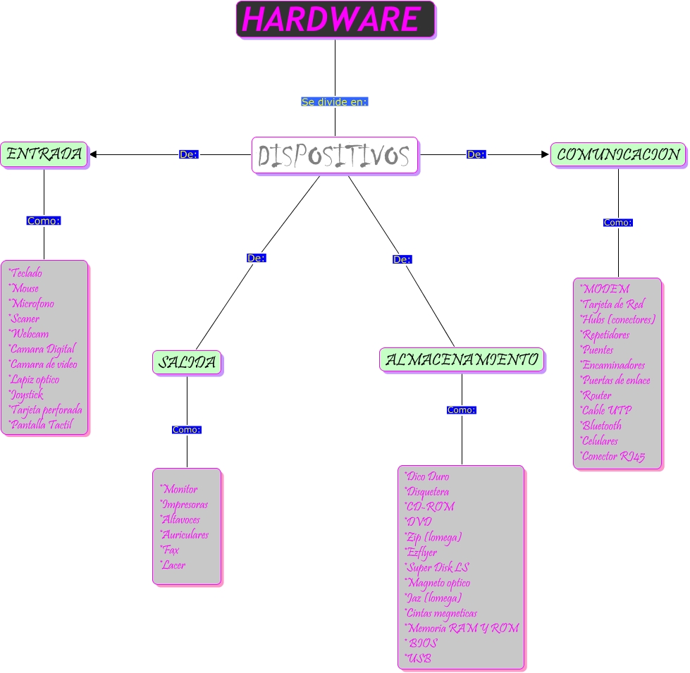 Este Cmap, tiene información relacionada con: HARDWARE, DISPOSITIVOS De: ALMACENAMIENTO, ENTRADA Como: *Teclado *Mouse *Microfono *Scaner *Webcam *Camara Digital *Camara de video *Lapiz optico *Joystick *Tarjeta perforada *Pantalla Tactil, DISPOSITIVOS De: SALIDA, HARDWARE Se divide en: DISPOSITIVOS, COMUNICACION Como: *MODEM *Tarjeta de Red *Hubs (conectores) *Repetidores *Puentes *Encaminadores *Puertas de enlace *Router *Cable UTP *Bluetooth *Celulares *Conector RJ45, DISPOSITIVOS De: COMUNICACION, ALMACENAMIENTO Como: *Dico Duro *Disquetera *CD-ROM *DVD *Zip (lomega) *Ezflyer *Super Disk LS *Magneto optico *Jaz (lomega) *Cintas megneticas *Memoria RAM Y ROM * BIOS *USB, DISPOSITIVOS De: ENTRADA, SALIDA Como: *Monitor *Impresoras *Altavoces *Auriculares *Fax *Lacer