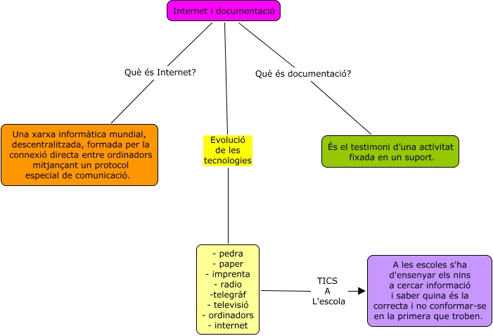 Este Cmap, tiene información relacionada con: Mapa Punt 1, Internet i documentació Què és Internet? Una xarxa informàtica mundial, descentralitzada, formada per la connexió directa entre ordinadors mitjançant un protocol especial de comunicació., Internet i documentació Evolució de les tecnologies - pedra - paper - imprenta - radio -telegràf - televisió - ordinadors - internet, Internet i documentació Què és documentació? És el testimoni d’una activitat fixada en un suport., - pedra - paper - imprenta - radio -telegràf - televisió - ordinadors - internet TICS A L'escola A les escoles s'ha d'ensenyar els nins a cercar informació i saber quina és la correcta i no conformar-se en la primera que troben.
