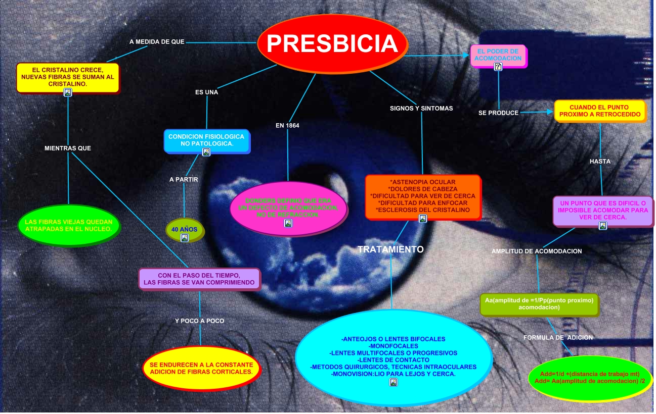 Este Cmap, tiene información relacionada con: presbicieFERNANDEZLOPEZNANCYGABRIELA3TM1, PRESBICIA A MEDIDA DE QUE EL CRISTALINO CRECE, NUEVAS FIBRAS SE SUMAN AL CRISTALINO., PRESBICIA ES UNA CONDICION FISIOLOGICA NO PATOLOGICA., *ASTENOPIA OCULAR *DOLORES DE CABEZA *DIFICULTAD PARA VER DE CERCA *DIFICULTAD PARA ENFOCAR *ESCLEROSIS DEL CRISTALINO TRATAMIENTO -ANTEOJOS O LENTES BIFOCALES -MONOFOCALES -LENTES MULTIFOCALES O PROGRESIVOS -LENTES DE CONTACTO -METODOS QUIRURGICOS, TECNICAS INTRAOCULARES -MONOVISION:LIO PARA LEJOS Y CERCA., UN PUNTO QUE ES DIFICIL O IMPOSIBLE ACOMODAR PARA VER DE CERCA. AMPLITUD DE ACOMODACION Aa(amplitud de =1/Pp(punto proximo) acomodacion), CONDICION FISIOLOGICA NO PATOLOGICA. A PARTIR 40 AÑOS, PRESBICIA SIGNOS Y SINTOMAS *ASTENOPIA OCULAR *DOLORES DE CABEZA *DIFICULTAD PARA VER DE CERCA *DIFICULTAD PARA ENFOCAR *ESCLEROSIS DEL CRISTALINO, EL CRISTALINO CRECE, NUEVAS FIBRAS SE SUMAN AL CRISTALINO. MIENTRAS QUE CON EL PASO DEL TIEMPO, LAS FIBRAS SE VAN COMPRIMIENDO, CUANDO EL PUNTO PROXIMO A RETROCEDIDO HASTA UN PUNTO QUE ES DIFICIL O IMPOSIBLE ACOMODAR PARA VER DE CERCA., EL PODER DE ACOMODACION SE PRODUCE CUANDO EL PUNTO PROXIMO A RETROCEDIDO, PRESBICIA DISMINUYE EL PODER DE ACOMODACION, Aa(amplitud de =1/Pp(punto proximo) acomodacion) FORMULA DE ADICION Add=1/d +(distancia de trabajo mt) Add= Aa(amplitud de acomodacion) /2, CON EL PASO DEL TIEMPO, LAS FIBRAS SE VAN COMPRIMIENDO Y POCO A POCO SE ENDURECEN A LA CONSTANTE ADICION DE FIBRAS CORTICALES., PRESBICIA EN 1864 DONDERS DEFINIO QUE ERA UN DEFECTO DE ACOMODACION, NO DE REFRACCION., EL CRISTALINO CRECE, NUEVAS FIBRAS SE SUMAN AL CRISTALINO. MIENTRAS QUE LAS FIBRAS VIEJAS QUEDAN ATRAPADAS EN EL NUCLEO.