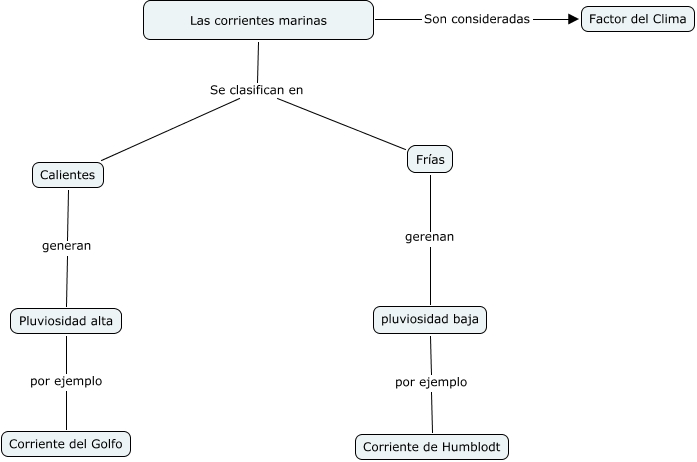 Este Cmap, tiene información relacionada con: Corrientes, Pluviosidad alta por ejemplo Corriente del Golfo, Las corrientes marinas Son consideradas Factor del Clima, Las corrientes marinas Se clasifican en Calientes, pluviosidad baja por ejemplo Corriente de Humblodt, Frías gerenan pluviosidad baja, Calientes generan Pluviosidad alta, Las corrientes marinas Se clasifican en Frías