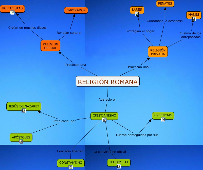 Este Cmap, tiene información relacionada con: CRISTIANISMO, RELIGIÓN OFICIAL Rendían culto al EMPERADOR, CRISTIANISMO Fueron perseguidos por sus CREENCIAS, RELIGIÓN OFICIAL Creían en muchos dioses POLITEISTAS, CRISTIANISMO La convirtió en oficial TEODOSIO I, RELIGIÓN PRIVADA El alma de los antepasados MANES, RELIGIÓN ROMANA Practican una RELIGIÓN OFICIAL, CRISTIANISMO Predicada por JESÚS DE NAZARET, RELIGIÓN PRIVADA Guardaban la despensa PENATES, CRISTIANISMO Concedió libertad CONSTANTINO, RELIGIÓN ROMANA Practican una RELIGIÓN PRIVADA, RELIGIÓN ROMANA Apareció el CRISTIANISMO, CRISTIANISMO Predicada por APÓSTOLES, RELIGIÓN PRIVADA Protegían el hogar LARES