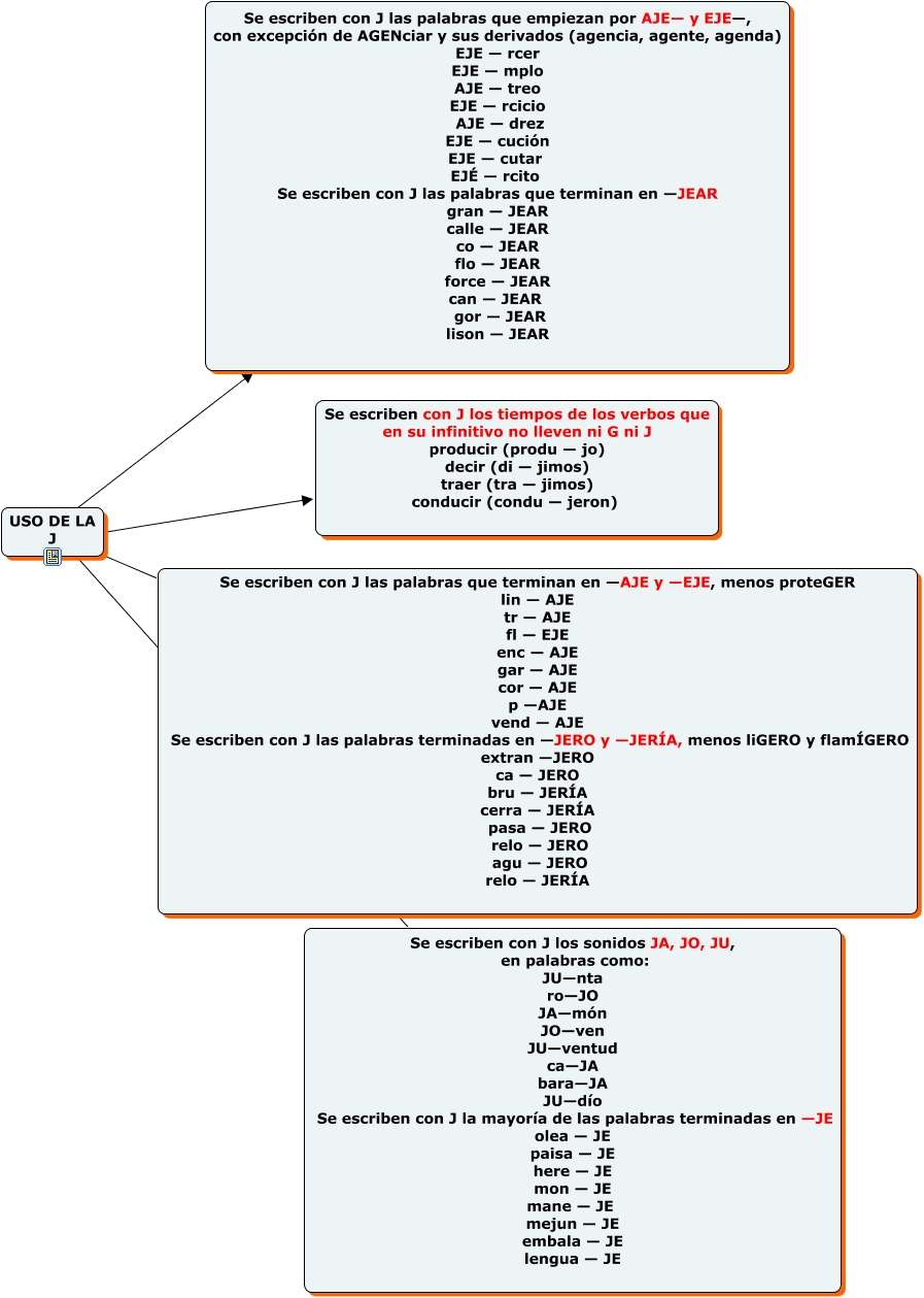 Este Cmap, tiene información relacionada con: USO DE LA J, USO DE LA J ???? Se escriben con J los tiempos de los verbos que en su infinitivo no lleven ni G ni J producir (produ — jo) decir (di — jimos) traer (tra — jimos) conducir (condu — jeron), USO DE LA J ???? Se escriben con J las palabras que terminan en —AJE y —EJE, menos proteGER lin — AJE tr — AJE fl — EJE enc — AJE gar — AJE cor — AJE p —AJE vend — AJE Se escriben con J las palabras terminadas en —JERO y —JERÍA, menos liGERO y flamÍGERO extran —JERO ca — JERO bru — JERÍA cerra — JERÍA pasa — JERO relo — JERO agu — JERO relo — JERÍA, USO DE LA J ???? Se escriben con J los sonidos JA, JO, JU, en palabras como: JU—nta ro—JO JA—món JO—ven JU—ventud ca—JA bara—JA JU—dío Se escriben con J la mayoría de las palabras terminadas en —JE olea — JE paisa — JE here — JE mon — JE mane — JE mejun — JE embala — JE lengua — JE, USO DE LA J ???? Se escriben con J las palabras que empiezan por AJE— y EJE—, con excepción de AGENciar y sus derivados (agencia, agente, agenda) EJE — rcer EJE — mplo AJE — treo EJE — rcicio AJE — drez EJE — cución EJE — cutar EJÉ — rcito Se escriben con J las palabras que terminan en —JEAR gran — JEAR calle — JEAR co — JEAR flo — JEAR force — JEAR can — JEAR gor — JEAR lison — JEAR