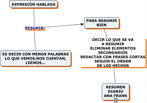 Este Cmap, tiene información relacionada con: RESUMIR, EXPRESIÓN HABLADA RESUMIR PARA RESUMIR BIEN, EXPRESIÓN HABLADA RESUMIR ES DECIR CON MENOS PALABRAS LO QUE VEMOS,NOS CUENTAN, LEEMOS..., PARA RESUMIR BIEN DECIR LO QUE SE VA A RESUMIR ELIMINAR ELEMENTOS SECUNDARIOS REDACTAR CON FRASES CORTAS SEGUIR EL ORDEN DE LOS HECHOS RESUMEN DIARIO ANA FRANK