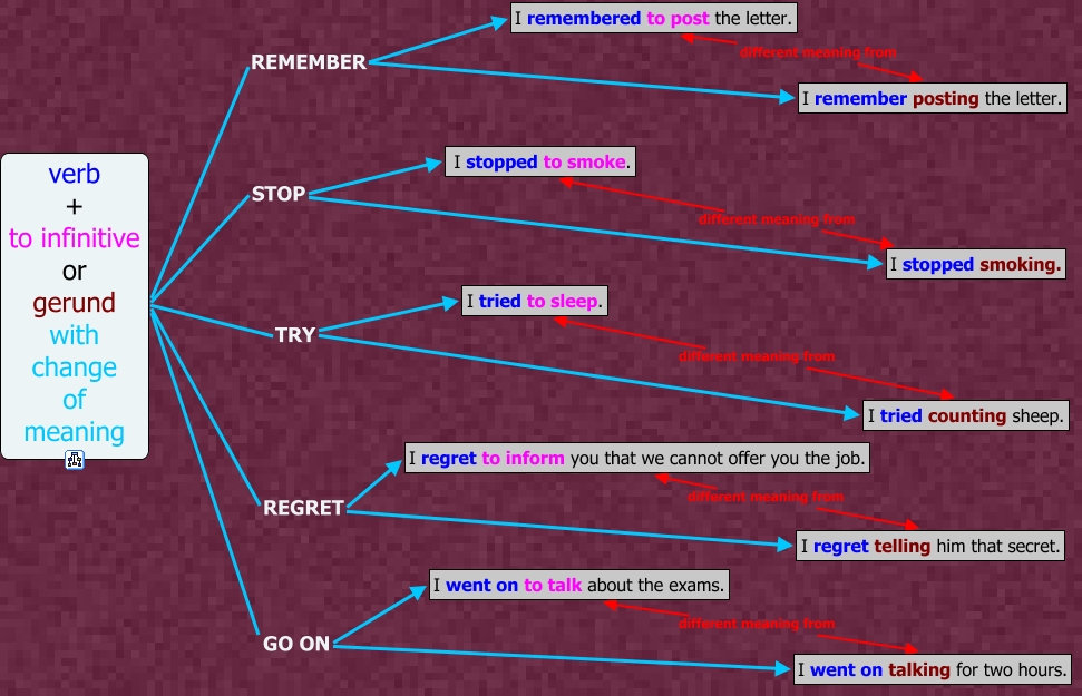 verb+infinitive_or_gerund_change_of_meaning, verb + to infinitive or gerund with change of meaning STOP I stopped smoking., verb + to infinitive or gerund with change of meaning REMEMBER I remembered to post the letter., verb + to infinitive or gerund with change of meaning REGRET I regret telling him that secret., verb + to infinitive or gerund with change of meaning REGRET I regret to inform you that we cannot offer you the job., verb + to infinitive or gerund with change of meaning TRY I tried to sleep., verb + to infinitive or gerund with change of meaning TRY I tried counting sheep., verb + to infinitive or gerund with change of meaning STOP I stopped to smoke., verb + to infinitive or gerund with change of meaning REMEMBER I remember posting the letter., verb + to infinitive or gerund with change of meaning GO ON I went on to talk about the exams., verb + to infinitive or gerund with change of meaning GO ON I went on talking for two hours.