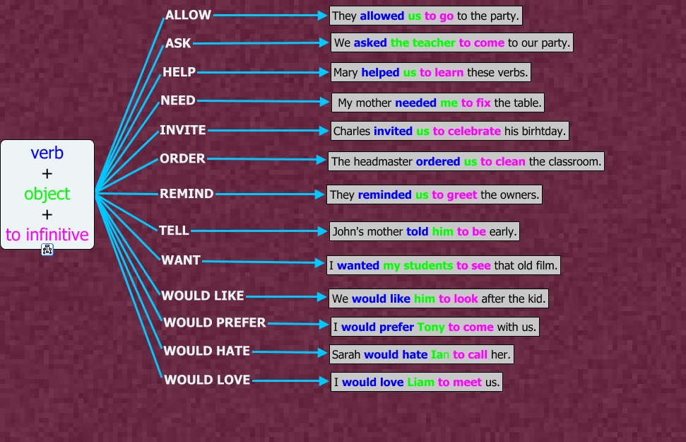 verb+object+to_infinitive, verb + object + to infinitive ALLOW They allowed us to go to the party., verb + object + to infinitive HELP Mary helped us to learn these verbs., verb + object + to infinitive WOULD PREFER I would prefer Tony to come with us., verb + object + to infinitive WOULD LIKE We would like him to look after the kid., verb + object + to infinitive WOULD HATE Sarah would hate Ian to call her., verb + object + to infinitive WANT I wanted my students to see that old film., verb + object + to infinitive REMIND They reminded us to greet the owners., verb + object + to infinitive NEED My mother needed me to fix the table., verb + object + to infinitive ASK We asked the teacher to come to our party., verb + object + to infinitive WOULD LOVE I would love Liam to meet us.