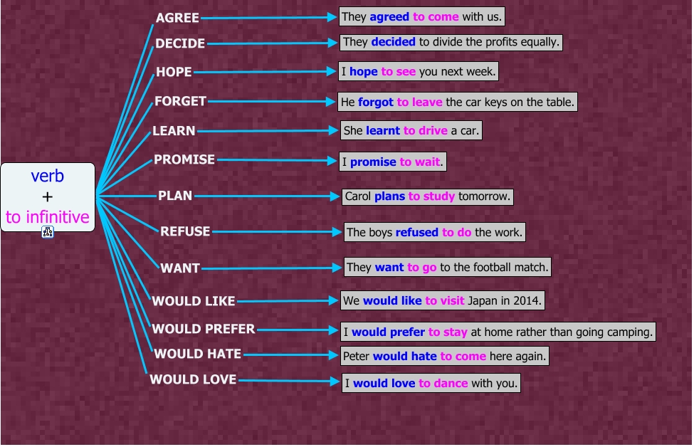 verb+to_infinitive, verb + to infinitive PLAN Carol plans to study tomorrow., verb + to infinitive WOULD LOVE I would love to dance with you., verb + to infinitive WANT They want to go to the football match., verb + to infinitive PROMISE I promise to wait., verb + to infinitive FORGET He forgot to leave the car keys on the table., verb + to infinitive DECIDE They decided to divide the profits equally., verb + to infinitive HOPE I hope to see you next week., verb + to infinitive REFUSE The boys refused to do the work., verb + to infinitive LEARN She learnt to drive a car., verb + to infinitive WOULD LIKE We would like to visit Japan in 2014.