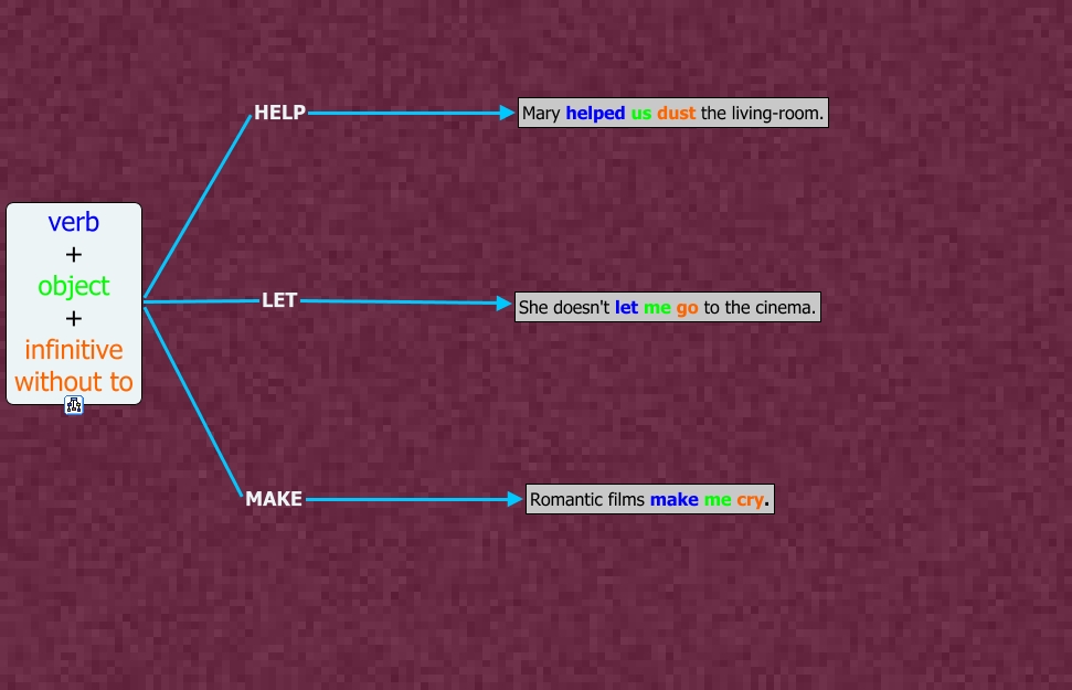 verb+object+infinitive, verb + object + infinitive without to HELP Mary helped us dust the living-room., verb + object + infinitive without to LET She doesn't let me go to the cinema., verb + object + infinitive without to MAKE Romantic films make me cry.