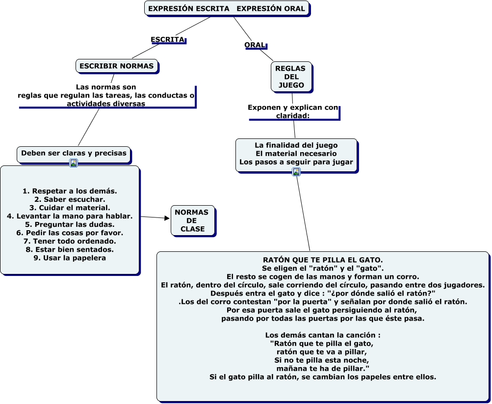 Este Cmap, tiene información relacionada con: ESCRIBIR NORMAS REGLAS DEL JUEGO, La finalidad del juego El material necesario Los pasos a seguir para jugar ???? RATÓN QUE TE PILLA EL GATO. Se eligen el "ratón" y el "gato". El resto se cogen de las manos y forman un corro. El ratón, dentro del círculo, sale corriendo del círculo, pasando entre dos jugadores. Después entra el gato y dice : "¿por dónde salió el ratón?" .Los del corro contestan "por la puerta" y señalan por donde salió el ratón. Por esa puerta sale el gato persiguiendo al ratón, pasando por todas las puertas por las que éste pasa. Los demás cantan la canción : "Ratón que te pilla el gato, ratón que te va a pillar, Si no te pilla esta noche, mañana te ha de pillar." Si el gato pilla al ratón, se cambian los papeles entre ellos., Deben ser claras y precisas ???? 1. Respetar a los demás. 2. Saber escuchar. 3. Cuidar el material. 4. Levantar la mano para hablar. 5. Preguntar las dudas. 6. Pedir las cosas por favor. 7. Tener todo ordenado. 8. Estar bien sentados. 9. Usar la papelera, EXPRESIÓN ESCRITA EXPRESIÓN ORAL ESCRITA ESCRIBIR NORMAS, EXPRESIÓN ESCRITA EXPRESIÓN ORAL ORAL REGLAS DEL JUEGO, ESCRIBIR NORMAS Las normas son reglas que regulan las tareas, las conductas o actividades diversas Deben ser claras y precisas, REGLAS DEL JUEGO Exponen y explican con claridad: La finalidad del juego El material necesario Los pasos a seguir para jugar, 1. Respetar a los demás. 2. Saber escuchar. 3. Cuidar el material. 4. Levantar la mano para hablar. 5. Preguntar las dudas. 6. Pedir las cosas por favor. 7. Tener todo ordenado. 8. Estar bien sentados. 9. Usar la papelera ???? NORMAS DE CLASE