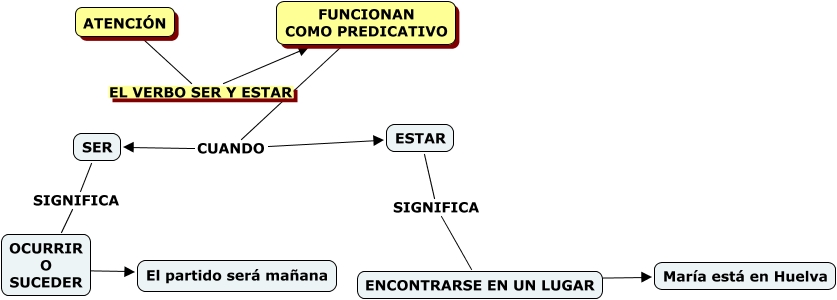 Este Cmap, tiene información relacionada con: ATENCIÓN, ESTAR SIGNIFICA ENCONTRARSE EN UN LUGAR, SER SIGNIFICA OCURRIR O SUCEDER, FUNCIONAN COMO PREDICATIVO CUANDO ESTAR, FUNCIONAN COMO PREDICATIVO CUANDO SER, ENCONTRARSE EN UN LUGAR ???? María está en Huelva, ATENCIÓN EL VERBO SER Y ESTAR FUNCIONAN COMO PREDICATIVO, OCURRIR O SUCEDER ???? El partido será mañana