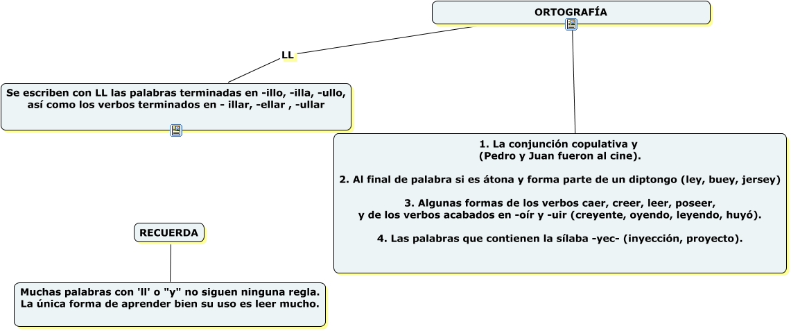 Este Cmap, tiene información relacionada con: ORTOGRAFÍA LL Y, RECUERDA ???? Muchas palabras con 'll' o "y" no siguen ninguna regla. La única forma de aprender bien su uso es leer mucho., ORTOGRAFÍA LL Se escriben con LL las palabras terminadas en -illo, -illa, -ullo, así como los verbos terminados en - illar, -ellar , -ullar, ORTOGRAFÍA y 1. La conjunción copulativa y (Pedro y Juan fueron al cine). 2. Al final de palabra si es átona y forma parte de un diptongo (ley, buey, jersey) 3. Algunas formas de los verbos caer, creer, leer, poseer, y de los verbos acabados en -oír y -uir (creyente, oyendo, leyendo, huyó). 4. Las palabras que contienen la sílaba -yec- (inyección, proyecto).
