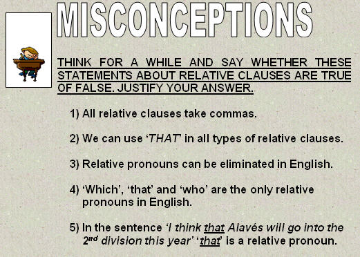 relative_clauses, ANTECEDENT which can indicate PEOPLE, RELATIVE CLAUSES are ADJECTIVAL CLAUSES, RELATIVE CLAUSES can be divided into NON-DEFINING, RELATIVE CLAUSES always follow the ANTECEDENT, modify a NOUN called ANTECEDENT, RELATIVE CLAUSES are not used for this, type DEFINING, RELATIVE CLAUSES can be divided into DEFINING, ANTECEDENT which can indicate OBJECTS, vary according to the ANTECEDENT