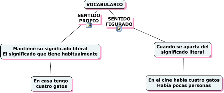 Este Cmap, tiene información relacionada con: SENTIDO PROPIO SENTIDO FIGURADO, Cuando se aparta del significado literal ???? En el cine había cuatro gatos Había pocas personas, VOCABULARIO SENTIDO FIGURADO Cuando se aparta del significado literal, Mantiene su significado literal El significado que tiene habitualmente ???? En casa tengo cuatro gatos, VOCABULARIO SENTIDO PROPIO Mantiene su significado literal El significado que tiene habitualmente
