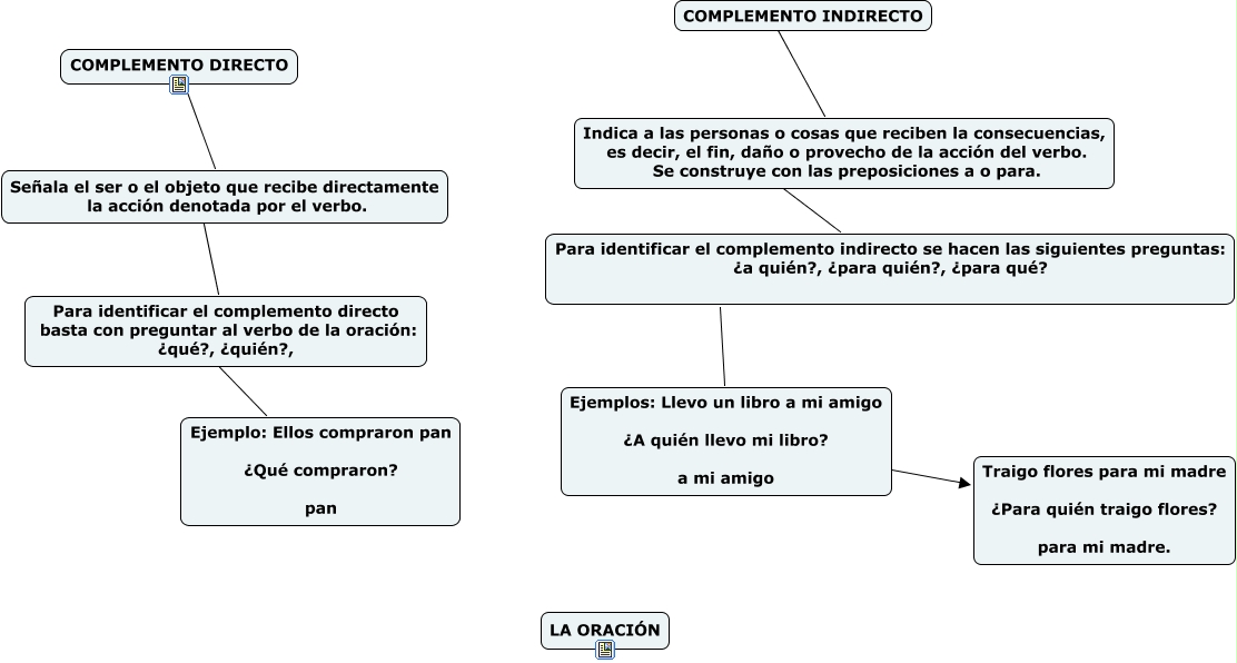 Este Cmap, tiene información relacionada con: COMPLEMENTO DIRECTO E INDIRECTO, Ejemplos: Llevo un libro a mi amigo ¿A quién llevo mi libro? a mi amigo ???? Traigo flores para mi madre ¿Para quién traigo flores? para mi madre., Señala el ser o el objeto que recibe directamente la acción denotada por el verbo. ???? Para identificar el complemento directo basta con preguntar al verbo de la oración: ¿qué?, ¿quién?,, Indica a las personas o cosas que reciben la consecuencias, es decir, el fin, daño o provecho de la acción del verbo. Se construye con las preposiciones a o para. ???? Para identificar el complemento indirecto se hacen las siguientes preguntas: ¿a quién?, ¿para quién?, ¿para qué?, COMPLEMENTO INDIRECTO ???? Indica a las personas o cosas que reciben la consecuencias, es decir, el fin, daño o provecho de la acción del verbo. Se construye con las preposiciones a o para., Para identificar el complemento directo basta con preguntar al verbo de la oración: ¿qué?, ¿quién?, ???? Ejemplo: Ellos compraron pan ¿Qué compraron? pan, Para identificar el complemento indirecto se hacen las siguientes preguntas: ¿a quién?, ¿para quién?, ¿para qué? ???? Ejemplos: Llevo un libro a mi amigo ¿A quién llevo mi libro? a mi amigo, COMPLEMENTO DIRECTO ???? Señala el ser o el objeto que recibe directamente la acción denotada por el verbo.