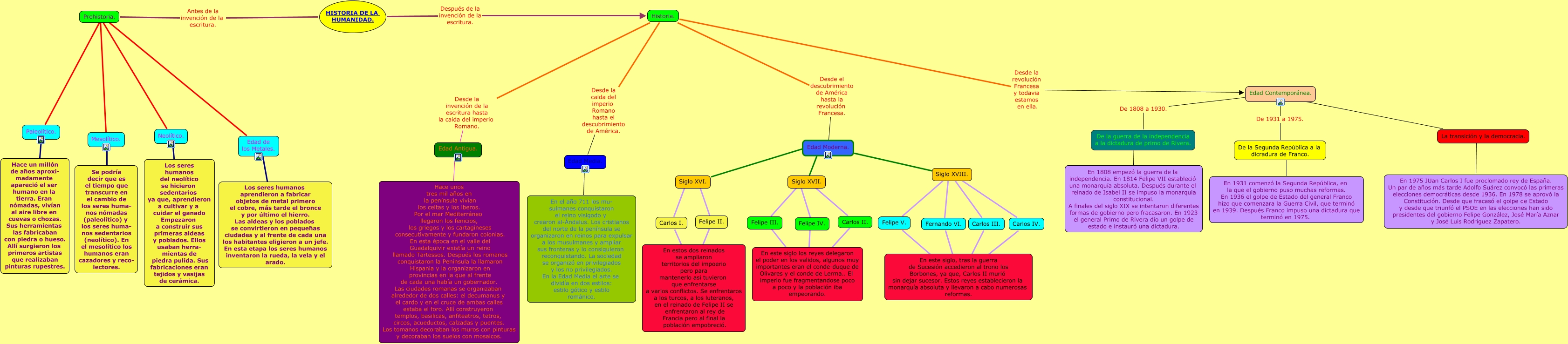 Este Cmap, tiene información relacionada con: Historia Humana, Edad Contemporánea. De 1931 a 1975. De la Segunda República a la dicradura de Franco., Fernando VI. ???? En este siglo, tras la guerra de Sucesión accedieron al trono los Borbones, ya que, Carlos II murió sin dejar sucesor. Estos reyes establecieron la monarquía absoluta y llevaron a cabo numerosas reformas., Edad de los Metales. ???? Los seres humanos aprendieron a fabricar objetos de metal primero el cobre, más tarde el bronce y por último el hierro. Las aldeas y los poblados se convirtieron en pequeñas ciudades y al frente de cada una los habitantes eligieron a un jefe. En esta etapa los seres humanos inventaron la rueda, la vela y el arado., Historia. Desde la revolución Francesa y todavia estamos en ella. Edad Contemporánea., Mesolítico. ???? Se podría decir que es el tiempo que transcurre en el cambio de los seres huma- nos nómadas (paleolítico) y los seres huma- nos sedentarios (neolítico). En el mesolítico los humanos eran cazadores y reco- lectores., Historia. Desde el descubrimiento de América hasta la revolución Francesa. Edad Moderna., Prehistoria. ???? Edad de los Metales., Carlos II. ???? En este siglo los reyes delegaron el poder en los validos, algunos muy importantes eran el conde-duque de Olivares y el conde de Lerma.. El imperio fue fragmentandose poco a poco y la población iba empeorando., Felipe V. ???? En este siglo, tras la guerra de Sucesión accedieron al trono los Borbones, ya que, Carlos II murió sin dejar sucesor. Estos reyes establecieron la monarquía absoluta y llevaron a cabo numerosas reformas., Felipe II. ???? En estos dos reinados se ampliaron territorios del impoerio pero para mantenerlo asi tuvieron que enfrentarse a varios conflictos. Se enfrentaros a los turcos, a los luteranos, en el reinado de Felipe II se enfrentaron al rey de Francia pero al final la población empobreció., Siglo XVIII. ???? Felipe V., Siglo XVIII. ???? Fernando VI., Siglo XVI. ???? Felipe II., Siglo XVII. ???? Carlos II., Prehistoria. ???? Neolítico., Mesolítico. ???? Prehistoria., De la Segunda República a la dicradura de Franco. ???? En 1931 comenzó la Segunda República, en la que el gobierno puso muchas reformas. En 1936 el golpe de Estado del general Franco hizo que comenzara la Guerra Civil, que terminó en 1939. Después Franco impuso una dictadura que terminó en 1975., La transición y la democracia. ???? Edad Contemporánea., Historia. Desde la caida del imperio Romano hasta el descubrimiento de América. Edad Media., Felipe IV. ???? En este siglo los reyes delegaron el poder en los validos, algunos muy importantes eran el conde-duque de Olivares y el conde de Lerma.. El imperio fue fragmentandose poco a poco y la población iba empeorando.