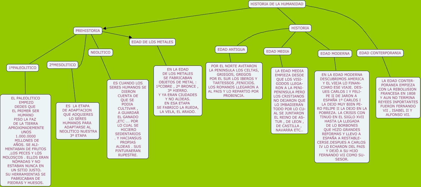 Este Cmap, tiene información relacionada con: HISTORIA, 1ºPALEOLITICO ???? EL PALEOLITICO EMPEZO DEDES QUE EL PRIMER SER HUMANO PISO LA FAZ DE LA TIERRA APROXIMADEMENTE UNOS 1.000.0000 MILLONES DE AÑOS. SE ALI- MENTABAN DE FRUTOS ,LOS PECES Y LOS MOLOSCOS . ELLOS ERAN NÓMADAS Y NO ESTABAN NUNCA EN UN SITIO JUSTO. SU HERRAMIENTAS SE FABRICABAN DE PIEDRAS Y HUESOS., PREHISTORIA ???? 2ºMESOLITICO, PREHISTORIA ???? EDAD DE LOS METALES, HISTORIA DE LA HUMANIDAD ???? EDAD CONTERPORANIA, EDAD MODERNA ???? EN LA EDAD MODERNA DESCUBRIMOS AMERICA Y EL VIEJA LO FINAN- CIARO ESE VIAJE. DES- UES CARLOS I Y FELI- PE II DE JARON A ESPAÑA 1º CARLOS I LA DEJO MUY BIEN PE- RO FELIPE II LA DEJO EN LA POBREZA. LA CRISIS CON TINUO EN EL SIGLO XVII HASTA LA LLEGADA DE LO BORBONES QUE HIZO GRANDES REFORMAS Y LLEVO A ESPAÑA A RESTABLE- CERSE.DESPUES A CARLOS IV LO ECHARON DEL PAIS Y DEJÓ A SU HIJO FERNANDO VII COMO SU- SESOR., EDAD CONTERPORANIA ???? LA EDAD CONTER- PORANEA EMPIEZA CON LA REBOLUSION FRANCESA EN 1808 Y AUN NO TERMINA REYEES INPORTANTES FUERON FERNANDO VII , ISABEL II Y ALFONSO VII., HISTORIA DE LA HUMANIDAD ???? PREHISTORIA, EDAD DE LOS METALES ???? EN LA EDAD DE LOS METALES SE FABRICABAN OBJETOS DE METAL : 1ºCOBRE , 2º BRONCE , 3º HIERRO. Y YA ERAN CIUDADES Y NO ALDEAS. EN ESA ETAPA SE FABRICO LA RUEDA, LA VELA, EL ARADO., HISTORIA ???? EDAD ANTIGUA, HISTORIA ???? EDAD MEDIA, PREHISTORIA ???? NEOLITICO, NEOLITICO ???? ES CUANDO LOS SERES HUMANOS SE DIERON CUENTA DE QUE SE PODIA CULTIVAR , A GUARDAR EL GANADO ,ETC ... POR LO CUAL SE HICIERO SEDENTARIOS . Y HACIANSUS PROPIAS ALDEAS . SUS PINTURAERAN RUPESTRE., EDAD MEDIA ???? LA EDAD MEDIA EMPIEZA DESDE QUE LOS VISI- GODOS LLEGA- RON A LA PENI- PENINSULA PERO LOS CRISTIANOS NO DEJARON QUE LO IMBADIERAN TODO POR LO CU- AL SE JUNTARON EL REINO DE AS- TUR , DE LEON , DE CASTILLA , NAVARRA ETC.., PREHISTORIA ???? 1ºPALEOLITICO, HISTORIA DE LA HUMANIDAD ???? HISTORIA, 2ºMESOLITICO ???? ES LA ETAPA DE ADAPTACION QUE ADQUIERES LO SERES HUMANOS PARA ADAPTARSE AL NEOLITICO NUESTRA 3º ETAPA, EDAD ANTIGUA ???? POR EL NORTE AVITARON LA PENINSULA LOS CELTAS, GRIEGOS, GREGOS POR EL SUR LOS IBEROS Y TARTESSOS ,FENICIOS. LOS ROMANOS LLEGARON A AL PAIS Y LO REPARTIO POR PROBINCIA., HISTORIA ???? EDAD MODERNA