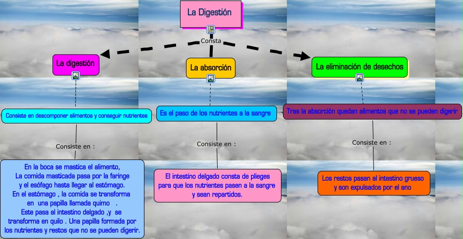 Este Cmap, tiene información relacionada con: digestion, La Digestión Consta La digestión, Es el paso de los nutrientes a la sangre Consiste en : El intestino delgado consta de plieges para que los nutrientes pasen a la sangre y sean repartidos., La Digestión Consta La absorción, Consiste en descomponer alimentos y conseguir nutrientes Consiste en : En la boca se mastica el alimento, La comida masticada pasa por la faringe y el esófago hasta llegar al estómago. En el estómago , la comida se transforma en una papilla llamada quimo . Este pasa al intestino delgado ,y se transforma en quilo . Una papilla formada por los nutrientes y restos que no se pueden digerir., La digestión ???? Consiste en descomponer alimentos y conseguir nutrientes, La eliminación de desechos ???? Tras la absorción quedan alimentos que no se pueden digerir, Tras la absorción quedan alimentos que no se pueden digerir Consiste en : Los restos pasan al intestino grueso y son expulsados por el ano, La Digestión Consta La eliminación de desechos, La absorción ???? Es el paso de los nutrientes a la sangre