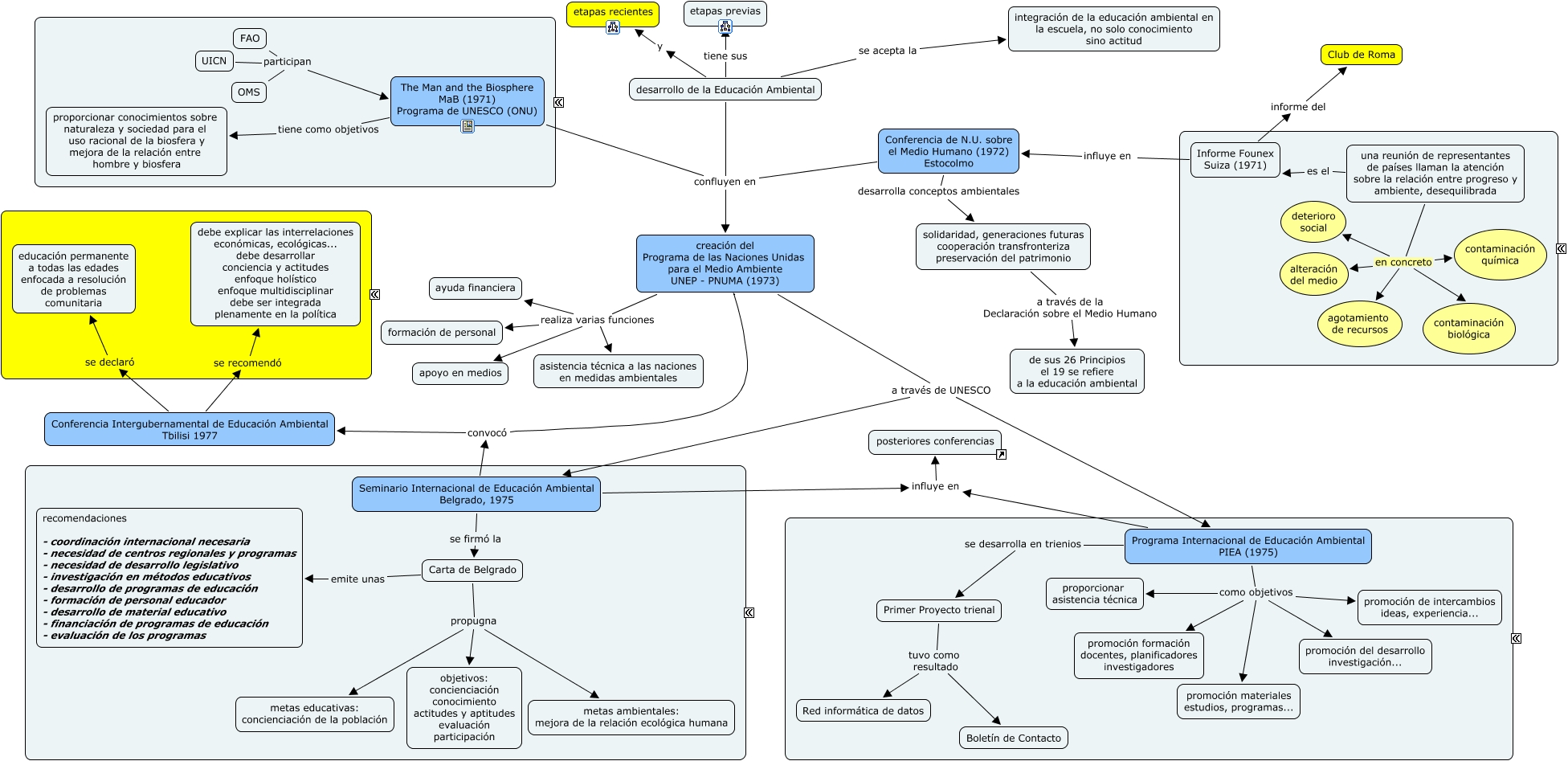 This Concept Map, created with IHMC CmapTools, has information related to: Desarrollo de la educación, UICN participan The Man and the Biosphere MaB (1971) Programa de UNESCO (ONU), Conferencia de N.U. sobre el Medio Humano (1972) Estocolmo confluyen en creación del Programa de las Naciones Unidas para el Medio Ambiente UNEP - PNUMA (1973), creación del Programa de las Naciones Unidas para el Medio Ambiente UNEP - PNUMA (1973) a través de UNESCO Seminario Internacional de Educación Ambiental Belgrado, 1975, Programa Internacional de Educación Ambiental PIEA (1975) como objetivos proporcionar asistencia técnica, Primer Proyecto trienal tuvo como resultado Red informática de datos, The Man and the Biosphere MaB (1971) Programa de UNESCO (ONU) tiene como objetivos proporcionar conocimientos sobre naturaleza y sociedad para el uso racional de la biosfera y mejora de la relación entre hombre y biosfera, Seminario Internacional de Educación Ambiental Belgrado, 1975 se firmó la Carta de Belgrado, The Man and the Biosphere MaB (1971) Programa de UNESCO (ONU) confluyen en creación del Programa de las Naciones Unidas para el Medio Ambiente UNEP - PNUMA (1973), Primer Proyecto trienal tuvo como resultado Boletín de Contacto, una reunión de representantes de países llaman la atención sobre la relación entre progreso y ambiente, desequilibrada en concreto contaminación biológica, Informe Founex Suiza (1971) informe del Club de Roma, FAO participan The Man and the Biosphere MaB (1971) Programa de UNESCO (ONU), Conferencia de N.U. sobre el Medio Humano (1972) Estocolmo desarrolla conceptos ambientales solidaridad, generaciones futuras cooperación transfronteriza preservación del patrimonio, Seminario Internacional de Educación Ambiental Belgrado, 1975 convocó Conferencia Intergubernamental de Educación Ambiental Tbilisi 1977, Programa Internacional de Educación Ambiental PIEA (1975) influye en posteriores conferencias, Programa Internacional de Educación Ambiental PIEA (1975) se desarrolla en trienios Primer Proyecto trienal, desarrollo de la Educación Ambiental confluyen en creación del Programa de las Naciones Unidas para el Medio Ambiente UNEP - PNUMA (1973), creación del Programa de las Naciones Unidas para el Medio Ambiente UNEP - PNUMA (1973) realiza varias funciones apoyo en medios, una reunión de representantes de países llaman la atención sobre la relación entre progreso y ambiente, desequilibrada en concreto alteración del medio, Seminario Internacional de Educación Ambiental Belgrado, 1975 influye en posteriores conferencias