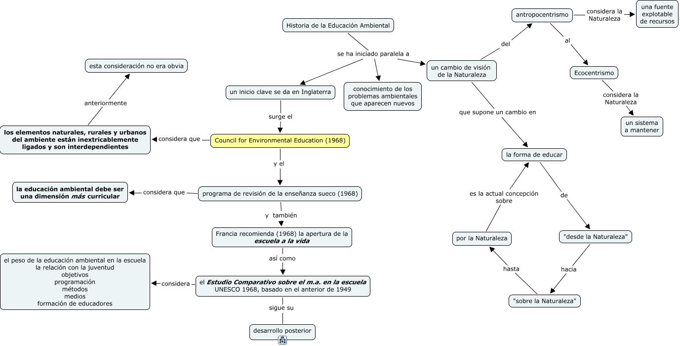 This Concept Map, created with IHMC CmapTools, has information related to: Historia, "desde la Naturaleza" hacia "sobre la Naturaleza", Council for Environmental Education (1968) y el programa de revisión de la enseñanza sueco (1968), los elementos naturales, rurales y urbanos del ambiente están inextricablemente ligados y son interdependientes anteriormente esta consideración no era obvia, programa de revisión de la enseñanza sueco (1968) y también Francia recomienda (1968) la apertura de la escuela a la vida, un cambio de visión de la Naturaleza del antropocentrismo, programa de revisión de la enseñanza sueco (1968) considera que la educación ambiental debe ser una dimensión más curricular, Francia recomienda (1968) la apertura de la escuela a la vida así como el Estudio Comparativo sobre el m.a. en la escuela UNESCO 1968, basado en el anterior de 1949, el Estudio Comparativo sobre el m.a. en la escuela UNESCO 1968, basado en el anterior de 1949 considera el peso de la educación ambiental en la escuela la relación con la juventud objetivos programación métodos medios formación de educadores, "sobre la Naturaleza" hasta por la Naturaleza, antropocentrismo al Ecocentrismo, un inicio clave se da en Inglaterra surge el Council for Environmental Education (1968), por la Naturaleza es la actual concepción sobre la forma de educar, antropocentrismo considera la Naturaleza una fuente explotable de recursos, un cambio de visión de la Naturaleza que supone un cambio en la forma de educar, Historia de la Educación Ambiental se ha iniciado paralela a un inicio clave se da en Inglaterra, Historia de la Educación Ambiental se ha iniciado paralela a conocimiento de los problemas ambientales que aparecen nuevos, la forma de educar de "desde la Naturaleza", Historia de la Educación Ambiental se ha iniciado paralela a un cambio de visión de la Naturaleza, Ecocentrismo considera la Naturaleza un sistema a mantener, Council for Environmental Education (1968) considera que los elementos naturales, rurales y urbanos del ambiente están inextricablemente ligados y son interdependientes