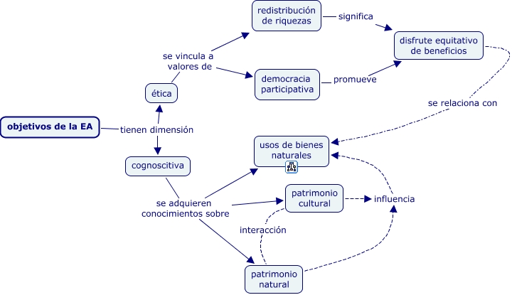 Este Cmap, tiene información relacionada con: objetivos EA, cognoscitiva se adquieren conocimientos sobre usos de bienes naturales, ética se vincula a valores de redistribución de riquezas, cognoscitiva se adquieren conocimientos sobre patrimonio natural, ética se vincula a valores de democracia participativa, disfrute equitativo de beneficios se relaciona con usos de bienes naturales, objetivos de la EA tienen dimensión ética, cognoscitiva se adquieren conocimientos sobre patrimonio cultural, redistribución de riquezas significa disfrute equitativo de beneficios, patrimonio cultural interacción patrimonio natural, patrimonio cultural influencia usos de bienes naturales, patrimonio natural influencia usos de bienes naturales, democracia participativa promueve disfrute equitativo de beneficios, objetivos de la EA tienen dimensión cognoscitiva