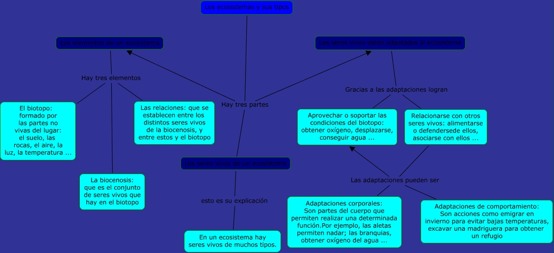 Este Cmap, tiene información relacionada con: tipos de ecosistemas, Los seres vivos estan adaptados al ecosistema Gracias a las adaptaciones logran Relacionarse con otros seres vivos: alimentarse o defendersede ellos, asociarse con ellos ..., Los elementos de un ecosistema Hay tres elementos Las relaciones: que se establecen entre los distintos seres vivos de la biocenosis, y entre estos y el biotopo, Los seres vivos estan adaptados al ecosistema Gracias a las adaptaciones logran Aprovechar o soportar las condiciones del biotopo: obtener oxígeno, desplazarse, conseguir agua ..., Los ecosistemas y sus tipos Hay tres partes Los elementos de un ecosistema, Relacionarse con otros seres vivos: alimentarse o defendersede ellos, asociarse con ellos ... Las adaptaciones pueden ser Adaptaciones corporales: Son partes del cuerpo que permiten realizar una determinada función.Por ejemplo, las aletas permiten nadar; las branquias, obtener oxígeno del agua ..., Los elementos de un ecosistema Hay tres elementos El biotopo: formado por las partes no vivas del lugar: el suelo, las rocas, el aire, la luz, la temperatura ..., Los seres vivos de un ecosistema esto es su explicación En un ecosistema hay seres vivos de muchos tipos., Los ecosistemas y sus tipos Hay tres partes Los seres vivos estan adaptados al ecosistema, Relacionarse con otros seres vivos: alimentarse o defendersede ellos, asociarse con ellos ... Las adaptaciones pueden ser Aprovechar o soportar las condiciones del biotopo: obtener oxígeno, desplazarse, conseguir agua ..., Los ecosistemas y sus tipos Hay tres partes Los seres vivos de un ecosistema, Los elementos de un ecosistema Hay tres elementos La biocenosis: que es el conjunto de seres vivos que hay en el biotopo, Relacionarse con otros seres vivos: alimentarse o defendersede ellos, asociarse con ellos ... Las adaptaciones pueden ser Adaptaciones de comportamiento: Son acciones como emigrar en invierno para evitar bajas temperaturas, excavar una madriguera para obtener un refugio