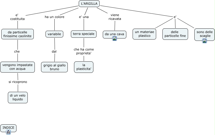 Questa Cmap, creata con IHMC CmapTools, contiene informazioni relative a: l'argilla, terra speciale che ha come proprieta' la plasticita', L'ARGILLA ha un colore variabile, vengono impastate con acqua si ricoprono di un velo liquido, L'ARGILLA e' sono delle scaglie, L'ARGILLA e' una terra speciale, L'ARGILLA e' delle particelle fine, L'ARGILLA viene ricavata da una cava, da particelle finissime caolinite che vengono impastate con acqua, variabile dal grigio al giallo bruno, L'ARGILLA e' un materiae plastico, L'ARGILLA e' costituita da particelle finissime caolinite