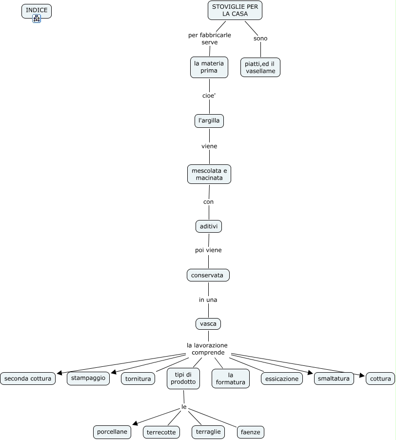 Questa Cmap, creata con IHMC CmapTools, contiene informazioni relative a: le stoviglie, conservata in una vasca, aditivi poi viene conservata, tipi di prodotto le terraglie, vasca la lavorazione comprende cottura, vasca la lavorazione comprende smaltatura, STOVIGLIE PER LA CASA per fabbricarle serve la materia prima, vasca la lavorazione comprende tornitura, vasca la lavorazione comprende seconda cottura, vasca la lavorazione comprende tipi di prodotto, tipi di prodotto le faenze, tipi di prodotto le terrecotte, tipi di prodotto le porcellane, STOVIGLIE PER LA CASA sono piatti,ed il vasellame, vasca la lavorazione comprende stampaggio, vasca la lavorazione comprende essicazione, la materia prima cioe' l'argilla, vasca la lavorazione comprende la formatura, l'argilla viene mescolata e macinata, mescolata e macinata con aditivi